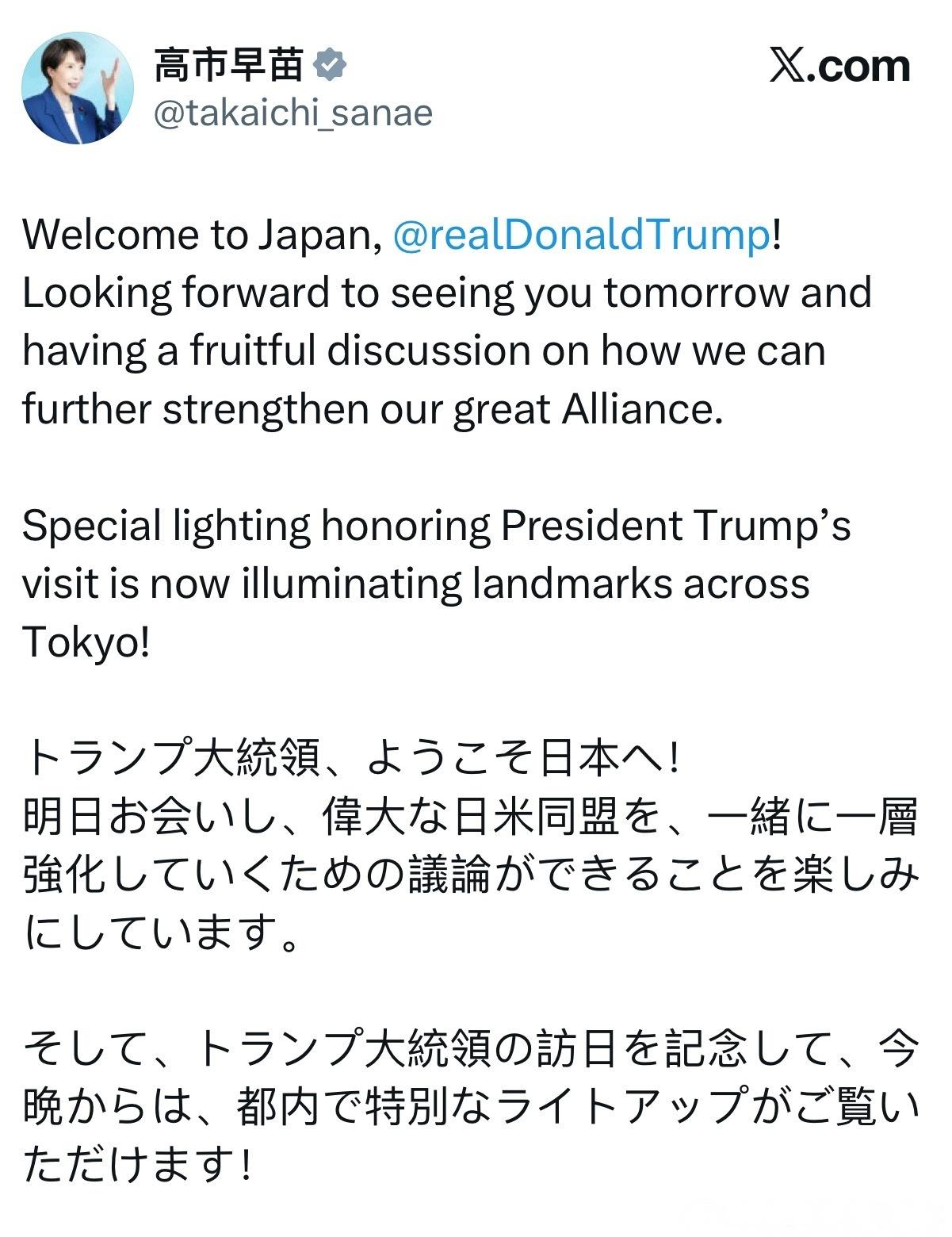 日本为了欢迎 Trump真是做足了功夫。 10月27日—28日,东京的各大地标建筑,同步亮起象征美国国旗的红、白、蓝三色灯光,为 Trump的到访上演特别灯光秀。 首相高市早苗在 X上发帖,热情欢迎Trump,期待 “共同推动伟大的日美同盟更上一层楼。” 感觉这灯光秀,似乎还没有深圳的漂亮。