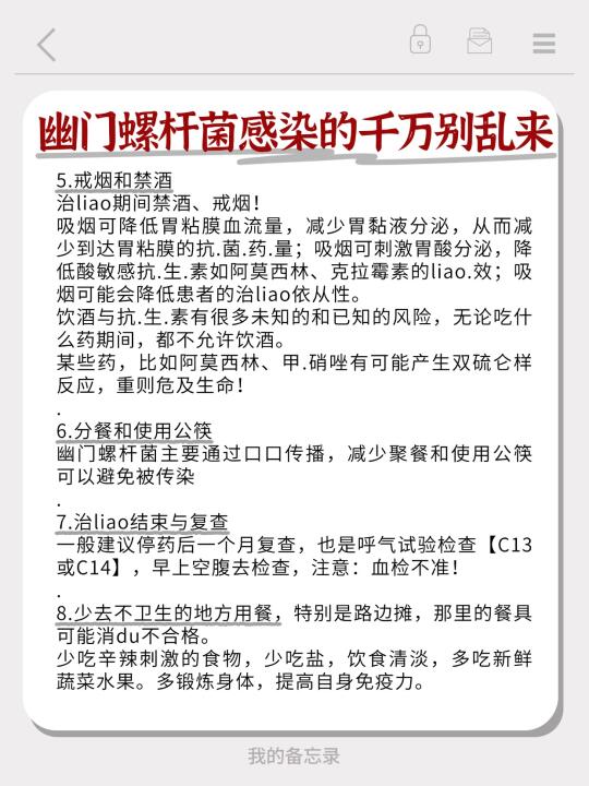 1.要吃够疗.程 国家共识建议的四联liao法,要求的liao程是 10-14 天,不能低于 10 天; . 2.记住用yao时间 两种抗.生.素,在饭后半小时服用。 拉唑类和铋剂在饭前 30 分钟; 需要注意的是: 一旦出现皮疹等过敏反应,要立即暂停服yao并寻求yi生帮助; 抗.生.素属于处.方,不要自行随意买; 肝肾功能不全、糖尿病、心脏病等慢性疾病患者、孕妇、哺乳期妇女、12 岁以下小孩,尤其不要擅自用yao!!! . 3.对抗益生菌的补充 由于四联用yao剂量大,副作用明显,加上目前我国抗.生.素耐药率逐年提升,在四联期间和停yao后持续的补充些针对性的益生菌非常有必要 . 4.口腔问题 幽门螺杆菌容易在口腔牙菌斑中生存,口腔清洁不到位也是根除失败或复发的重要原因,每天两次刷牙、饭后漱口,这样可以减少 幽门螺杆菌在口腔的繁殖 . 5.戒烟和禁酒 治liao期间禁酒、戒烟! 吸烟可降低胃粘膜血流量,减少胃黏液分泌,从而减少到达胃粘膜的抗.菌.药.量;吸烟可刺激胃酸分泌,降低酸敏感抗.生.素如阿莫西林、克拉霉素的liao.效;吸烟可能会降低患者的治liao依从性。 饮酒与抗.生.素有很多未知的和已知的风险,无论吃什么药期间,都不允许饮酒。 某些药,比如阿莫西林、甲.硝唑有可能产生双硫仑样反应,重则危及生命! . 6.分餐和使用公筷 幽门螺杆菌主要通过口口传播,减少聚餐和使用公筷可以避免被传染 . 7.治liao结束与复查 一般建议停药后一个月复查,也是呼气试验检查【C13或C14】,早上空腹去检查,注意:血检不准! . 8.少去不卫生的地方用餐,特别是路边摊,那里的餐具可能消du不合格。 少吃辛辣刺激的食物,少吃盐,饮食清淡,多吃新鲜蔬菜水果。多锻炼身体,提高自身免疫力。 卫乐舒益生菌 维普生猴头菇粉 幽门螺旋杆菌 幽门螺杆菌 幽门 益生菌 养胃