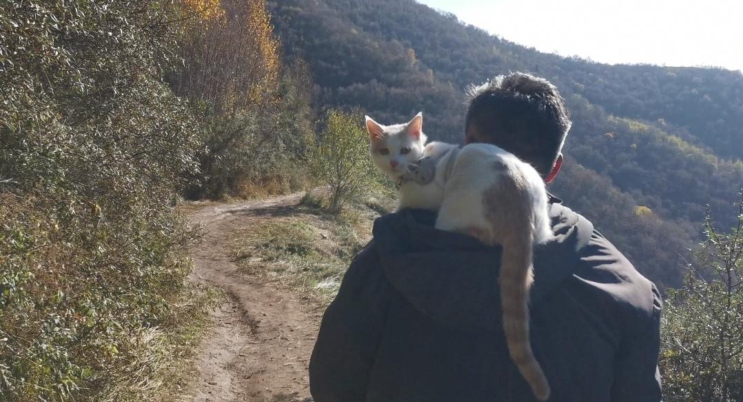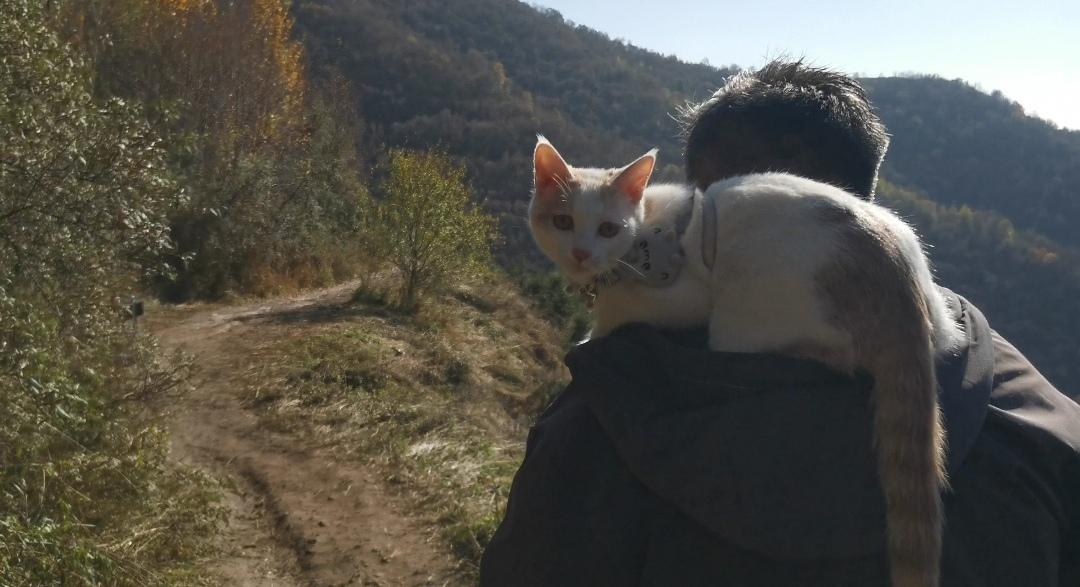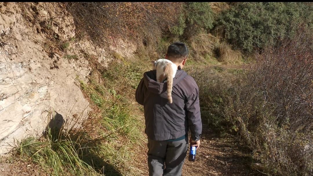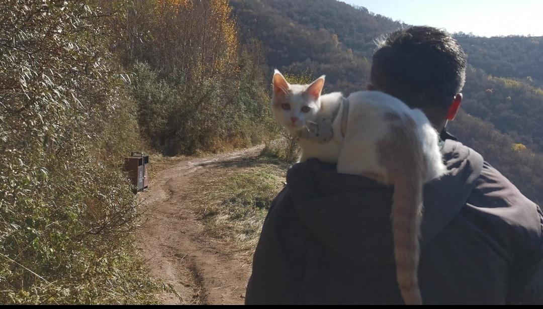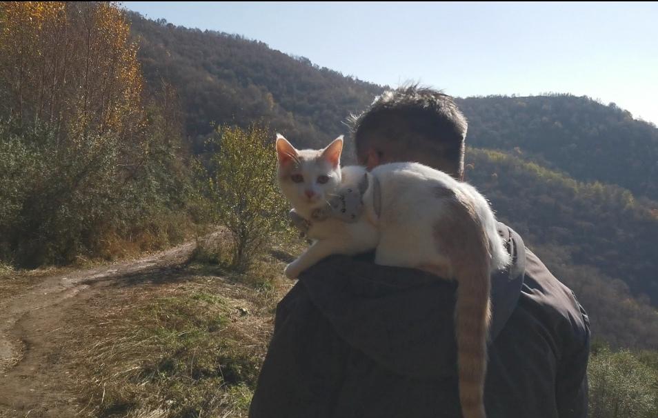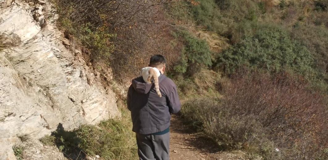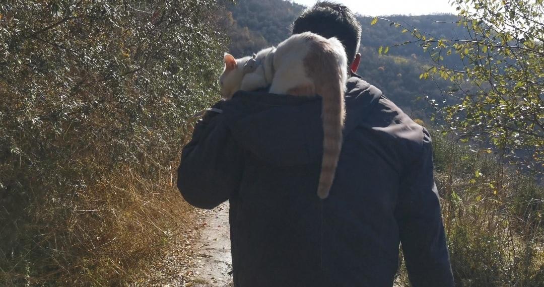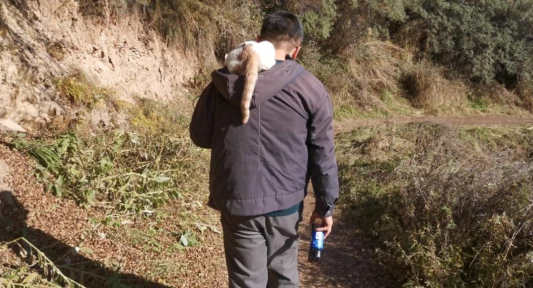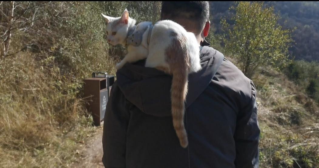 这只猫咪与主人形影不离 记者王志俭(穿石)文图 今天我在云顶山采风时,无意在下山土路上遇到、一位肩背宠物猫行走的路人。 记者感到新奇,便和他边走边聊。这位年轻男子说,他是一名旅游徒步爱好者,今早四点就从张掖出发了。从网上得知兰州云顶山风景不错,便按着网上导游路线来到云顶山。欣赏了云顶山的秋色之美,感觉不虚此行。没想到兰州的美景这么多,以前只知道兰州的五泉山、白塔山、金城等公园,这次领略了石佛沟公园的云顶山,被这里壮观的秋季美景震撼了! 我俩话题扯到他肩上的猫咪,瞬间这位年轻男子脸上露出疼爱的神情。他说这只猫出月后就和他在一起。除非特殊场合不能带猫外,一般情况下无论他走到那里都带着猫。有时抱在怀里,有时就卧在他的肩上。猫咪非常听他的话,从不给他惹事。 由于他是个体创业者,所以每天上班也会带上猫咪。如今猫咪一天离不开他,他也一天离不开猫咪。猫咪成了他生活中不可或缺的一部分。“既然和这只猫和我有缘分,那我就要一直把它当成我最好的朋友!”我俩分别时,年轻男子信誓旦旦对记者说到。