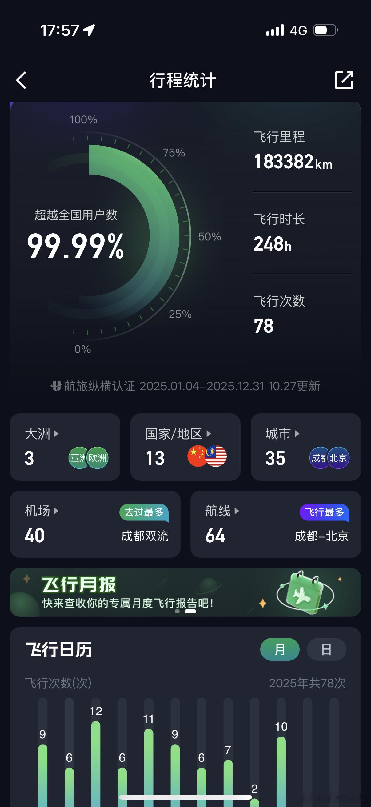 今年已经飞了78次了,历史最高了,接下来两个月应该不会飞太多了,想一年内破百感觉