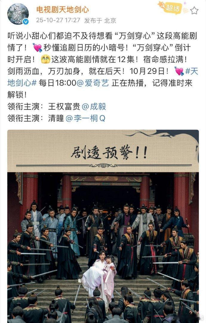 天地剑心官博剧透12集有万剑穿心 全网等疯的名场面要来了!12集万剑穿心,富贵鲜血淋漓的成长太真实,成毅破碎感拉满,备好纸巾等周三!天地剑心