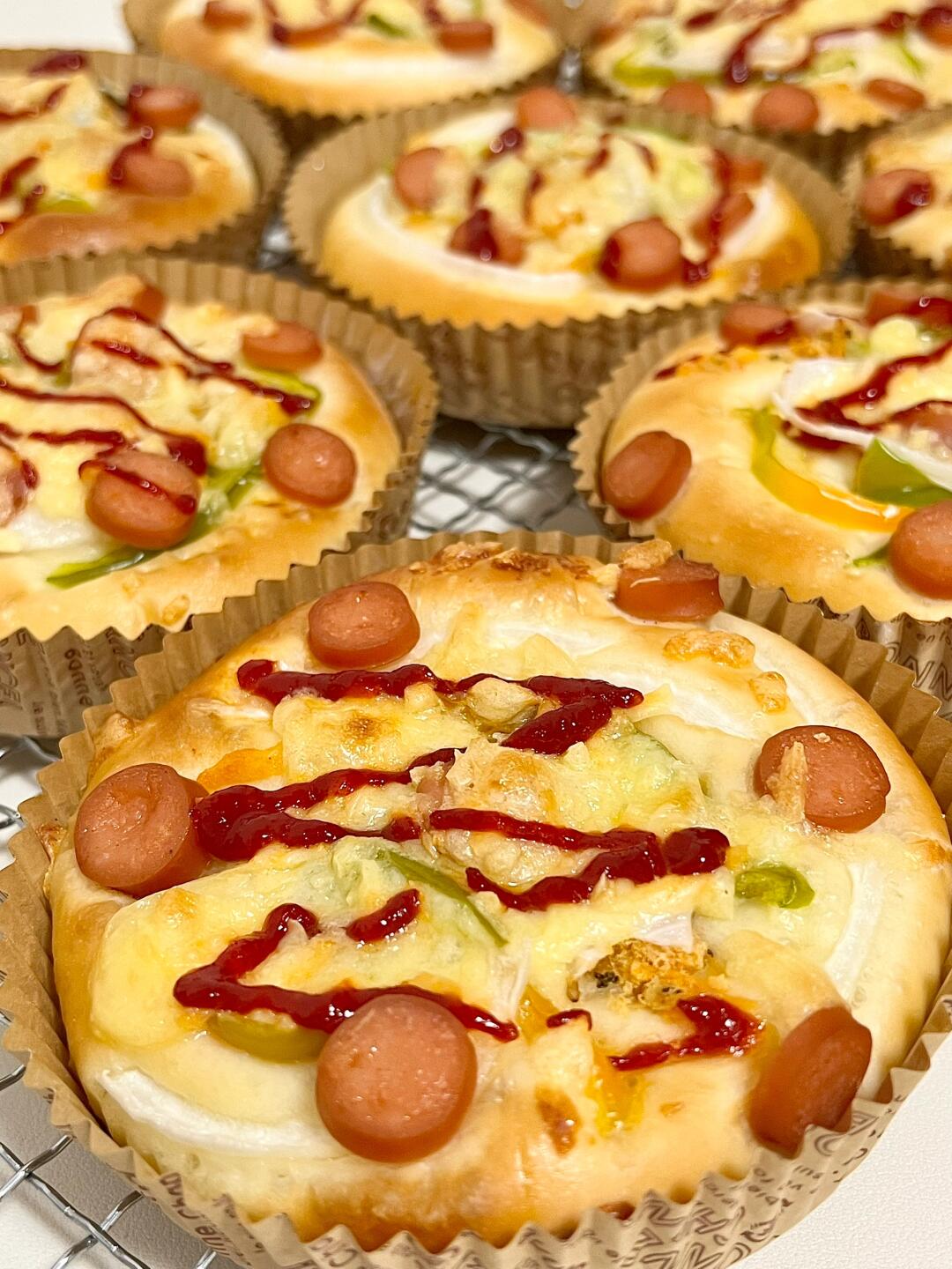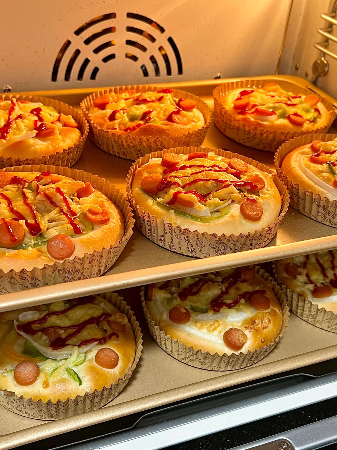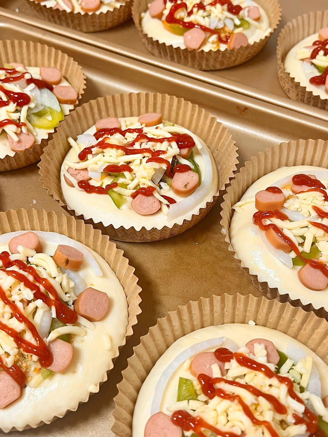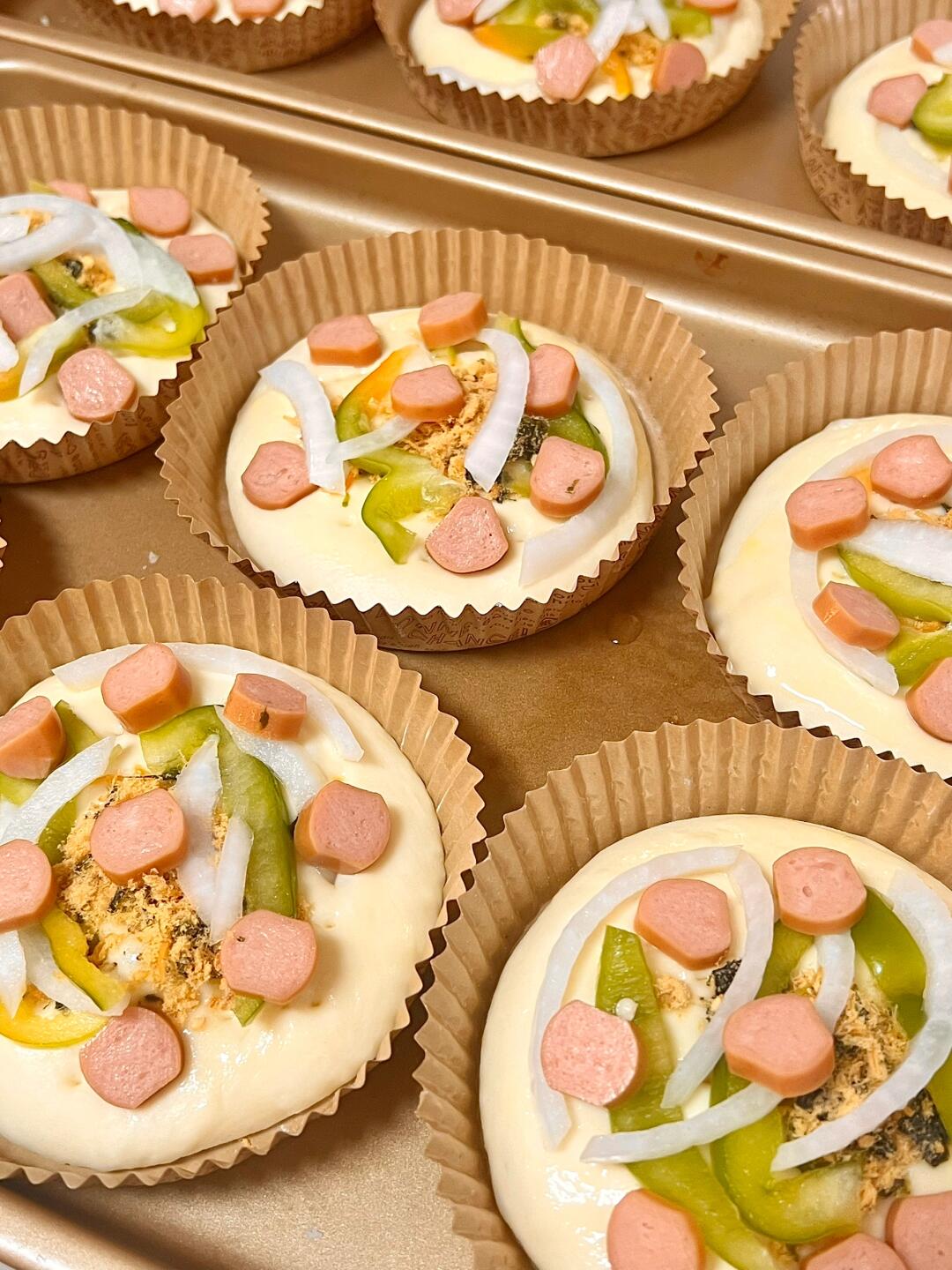 6⃣️发酵至体积1.5倍大,表面刷蛋液,用叉子扎孔,放肉松、青椒、洋葱、香肠,最后撒马苏里拉芝士,挤番茄酱