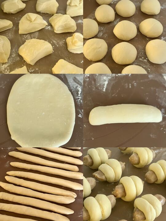 4⃣️取一个面团,轻轻擀开成长方形,底边压薄,自上而下卷起,搓长,缠绕在香肠上,放在烤盘里,
