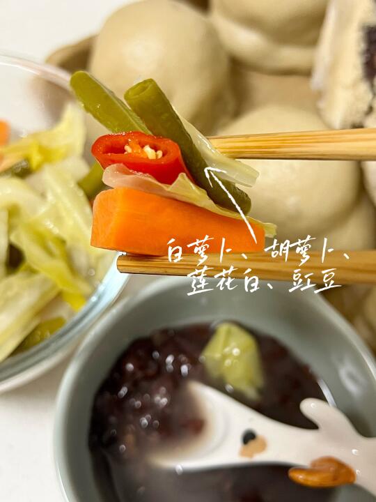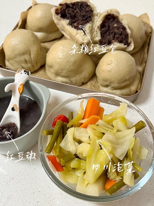 🫘剩下一点红豆馅做成红豆粥,搭配吉香居四川老坛泡菜,就是完美的一餐了~