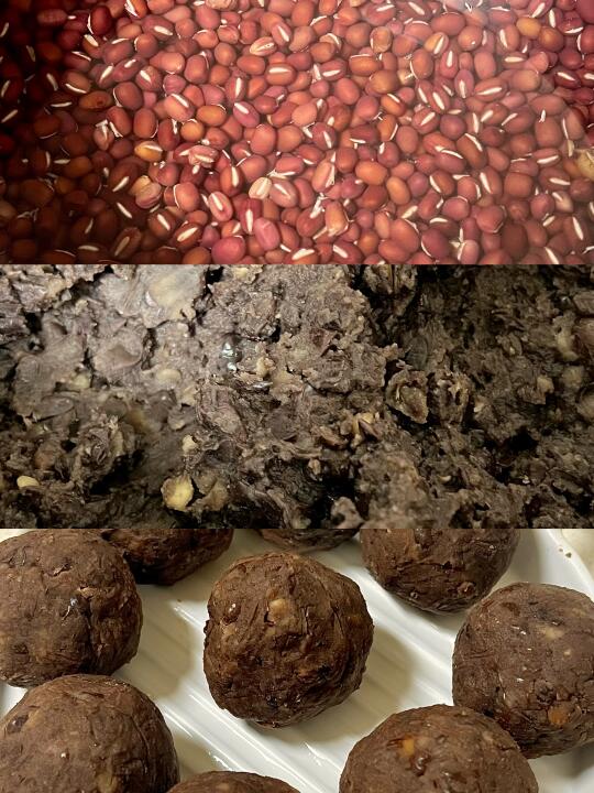 2️⃣煮好的红豆用勺子压成泥状,放凉分成小份备用