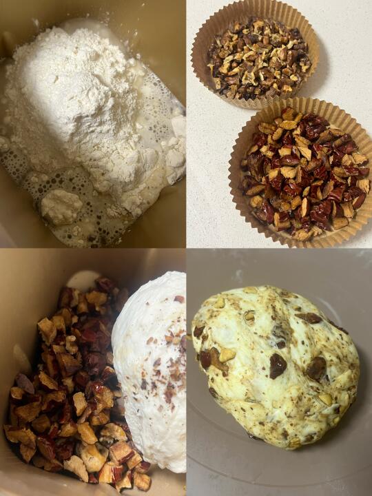 新良大师硬红高筋面粉300克|冰水170克|核桃仁40克|红枣40克|干酵母粉3克|盐1克