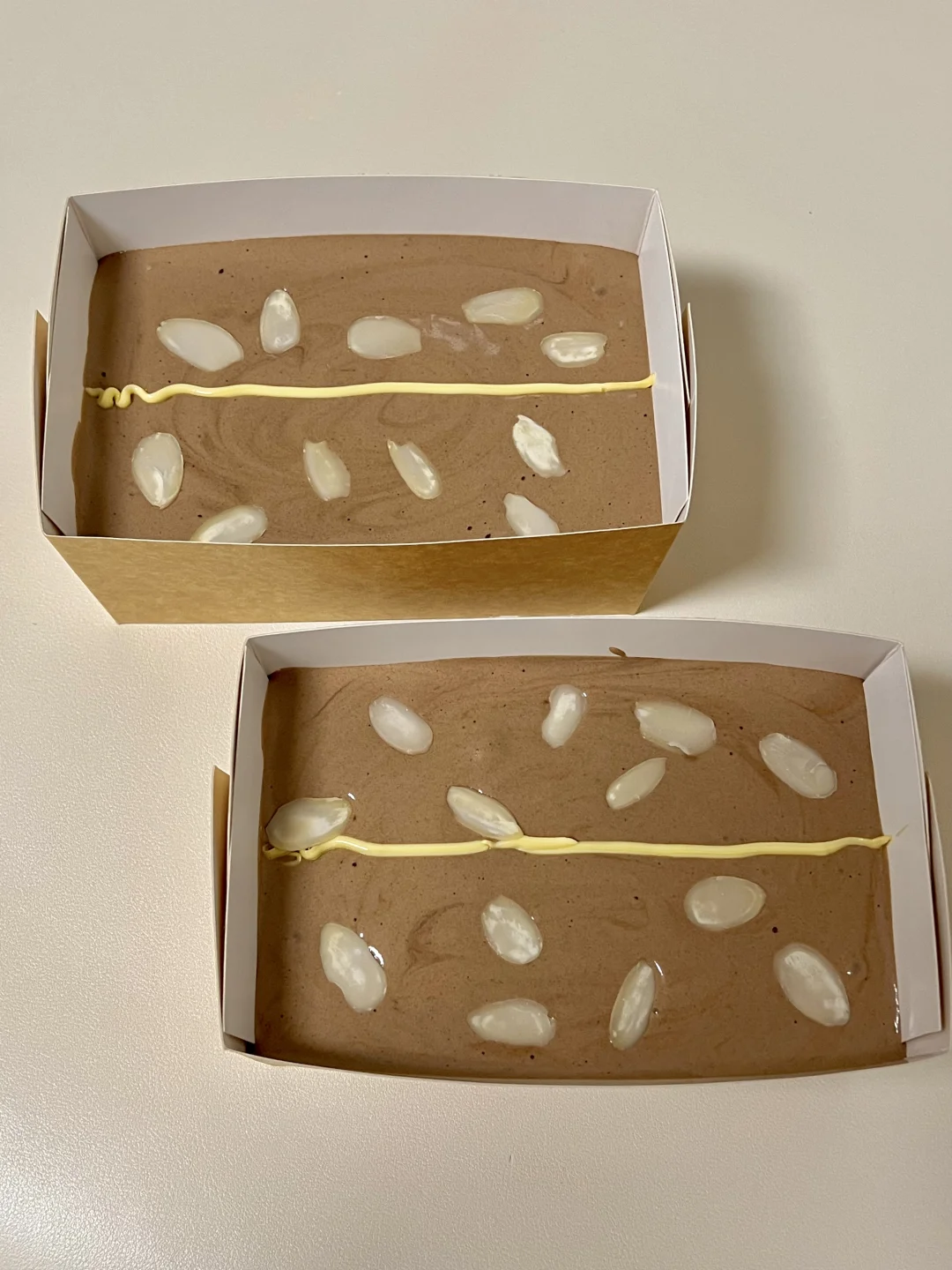 7️⃣蛋清和蛋黄糊分两次翻拌均匀,混合好的面糊倒入模具中,轻震模具去除部分气泡,表面用软化的黄油画一条线,再撒杏仁片装饰