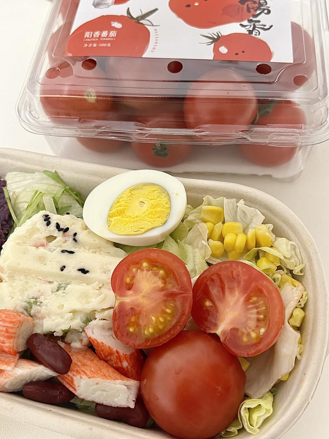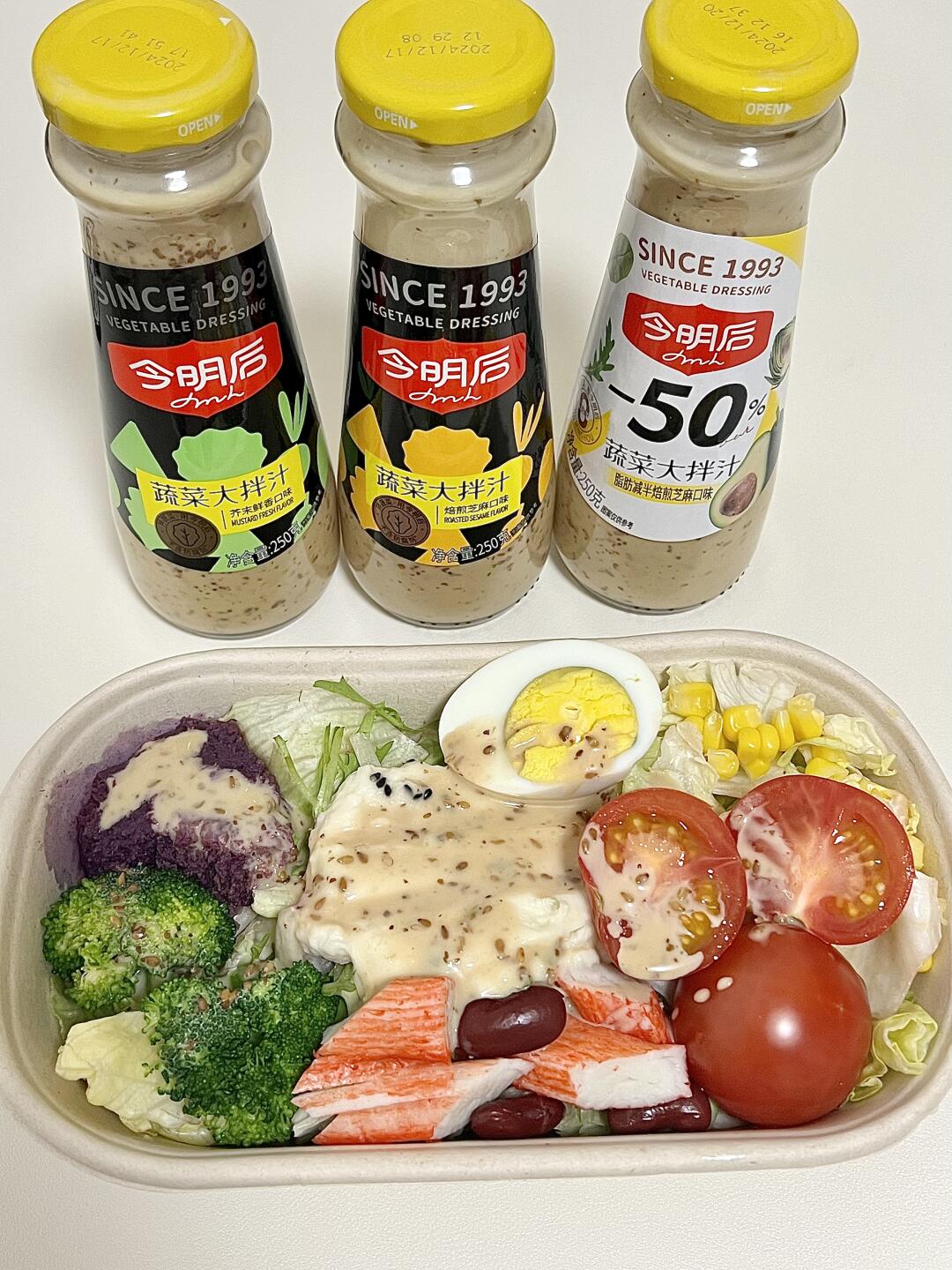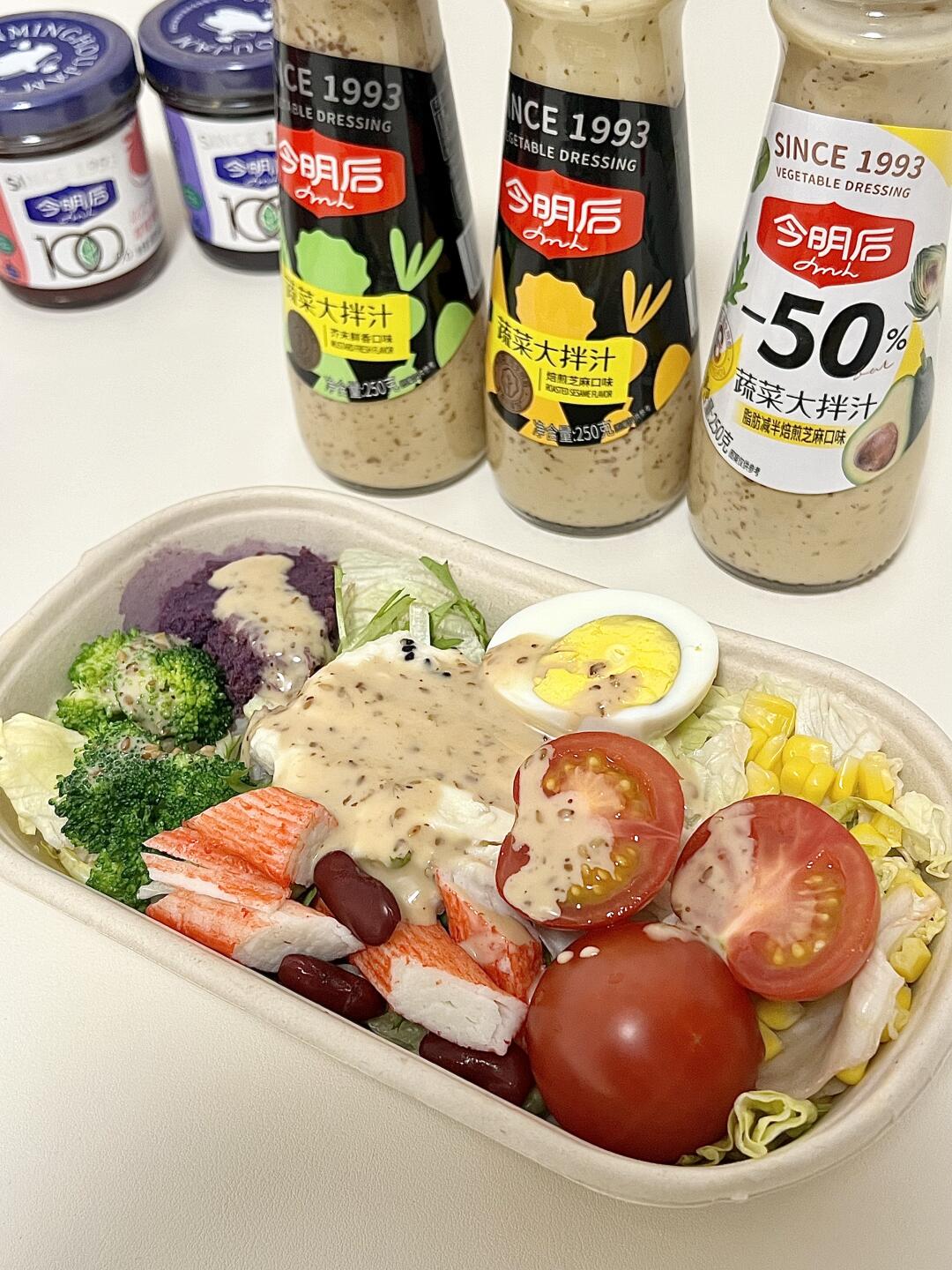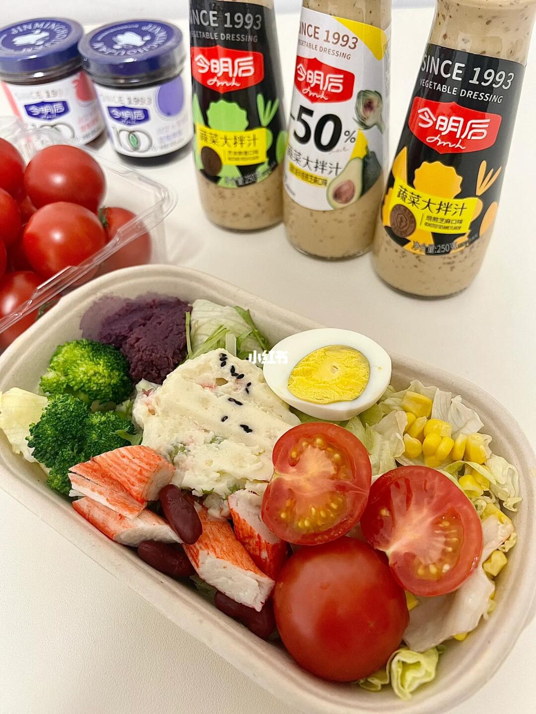 🥬蔬菜沙拉: 可以准备🥬生菜、🥒黄瓜、🍅番茄、紫甘蓝等新鲜蔬菜,切成合适的块状或丝状,再加入蟹柳、🥚水煮鸡蛋等优质蛋白质,紫薯、🥔土豆煮熟压成泥补充优质碳水,用蔬菜大拌汁拌匀,富含膳食纤维与蛋白质,低脂又饱腹。 - 🍞果酱吐司: 可选择全麦吐司,相对更健康,涂抹一层自己喜欢的果酱,比如🍓草莓酱、🫐蓝莓酱等,搭配着沙拉一起吃,营养更均衡❗️