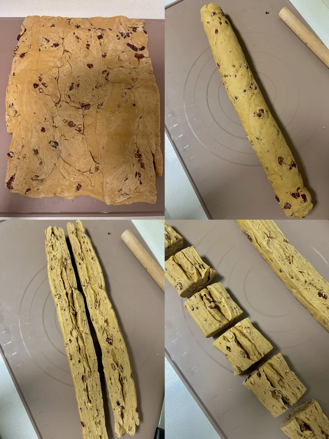 3️⃣把面团切成小块,拼成长方形,擀开厚度在1厘米左右,自上而下卷起,纵向切开,再横切成小块