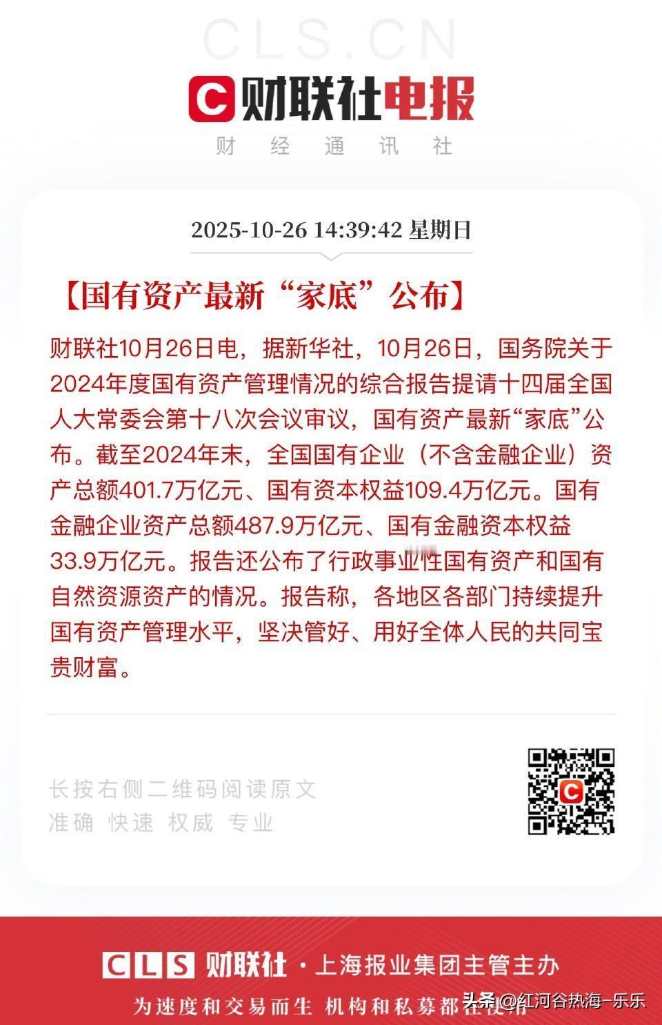 这些数据相当可贵。 国企(非金融企业),比如像中石油、国家电网这些,到2024年底,它们总共有 401.7万亿元资产,扣掉负债后109.4万亿元。 国有金融机构比如像各大银行、证券公司、保险公司。资产总额总有487.9万亿元,这也包括了各类存款,其中属于国家出资的收益是30多万亿。