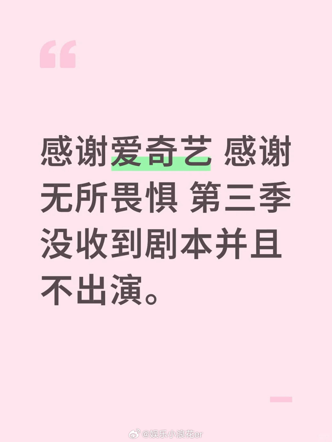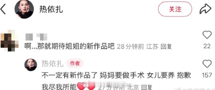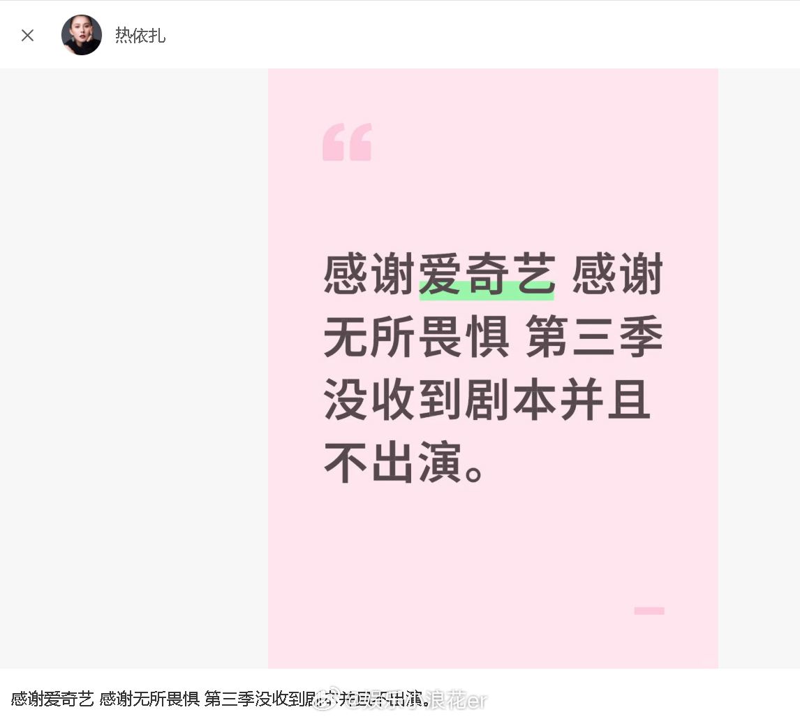热依扎称不出演无所畏惧第三季热依扎发文 热依扎发文:“感谢爱奇艺 感谢无所畏惧 第三季没收到剧本并且不出演。” 评论里热依扎还说:“不一定有新作品了。”啊??这是咋了?