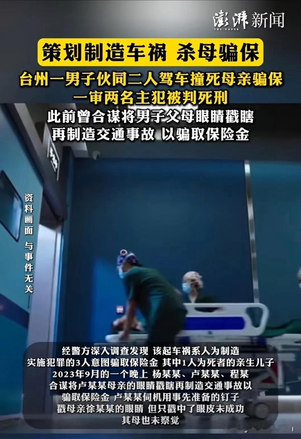 浙江台州,44岁女子车祸住院,其23岁儿子偷走她身份证和银行卡,把她保险理赔的312300元全部转走给其同伙。之后又和2个同伙商议把母亲眼睛戳瞎制造交通事故,骗取保险理赔。 未果后竟把母亲骗到路边,让其同伙开车撞死母亲。女子丈夫说出的1个真相,却让人不寒而栗! 这名23岁的儿子叫卢某某,和同伙杨某某、程某是初中同学,三人踏入社会后混在一起,杨某某向来出手阔绰,成了三人中的“带头大哥”。 卢某某打小就怕杨某某,日常吃穿住行全由对方拿主意,钱也归杨某某统一保管支配,这种依附关系让他彻底丧失了判断能力。 2023年4月,卢某某的母亲徐某某因交通事故住院,7月保险公司将31万余元理赔款转入徐某某账户,这笔钱成了悲剧的导火索。卢某某早就和杨某某商议好要偷这笔钱,他趁母亲住院,偷偷摸走身份证和银行卡,连密码都全盘告知杨某某。 当天,杨某某就去柜台取现2万,卢某某自己操作母亲的支付宝转走3万,第二天杨某某再取走26.23万,短短两天,徐某某的救命钱就被两人瓜分挥霍。 他们买最新款的手机,租豪车四处游玩,很快就把31万余元花得一干二净。徐某某出院后发现卡内空空,质问儿子,卢某某还撒谎说钱用来帮父亲还了贷款。 钱花光了,三人又陷入无钱可用的困境。杨某某查到“戳瞎眼睛能赔五六十万,撞死能赔一百多万”,当即提议再从徐某某身上下手。 2023年9月的一个晚上,卢某某以去外婆家为由,骑电动车载着母亲出门,程某开车、杨某某坐副驾驶在后尾随。 到了一座立交桥下,程某故意追尾,卢某某趁机拿出准备好的钉子想戳母亲的眼睛,可他终究还是怕,加上母亲下意识闭眼,只戳中了眼皮,徐某某竟丝毫没察觉儿子的恶意。 第一次失败后,杨某某又把目标换成了卢某某的父亲。 他和卢某某用树枝戳伤卢父的眼睛,再制造追尾事故,这次只骗到1318元保险金。两次都没拿到大额赔偿,杨某某索性提议直接撞死徐某某,卢某某竟然同意了。 杨某某最初想让卢某某带爷爷闯红灯制造事故,卢某某说“对爷爷有感情”拒绝了,转头就应承对母亲下手,只因为他觉得“和母亲关系一般”。 三人开始周密策划,专门选了椒江区章安街道九子村一条无监控的村路作案。 他们上网查“撞死要多少码”,确定70码以上能致命;还约定好理赔款的分成比例,杨某某拿六成,卢某某拿四成,程某能得10万;甚至因为原定作案日是中秋,特意推迟一天,仿佛在执行一件普通任务。 2023年9月30日晚,卢某某把母亲从出租屋骗出来,带到约定地点后,让母亲站在路南侧,自己借故站到北侧。 杨某某驾驶凯迪拉克以76公里的时速撞过去,徐某某当场被撞飞进田里,颅脑和胸部严重受损,送医后不治身亡。三人还装模作样报警,谎称是意外车祸。 案件败露源于保险公司员工的警觉,对方发现卢某某手机里有杨某某发来的“聊天记录等一下删了”的信息,再联想到徐某某刚理赔完31万,卢某某却还在四处借钱,立刻察觉不对劲。警方深入调查,这起蓄意谋杀案很快水落石出。 卢某某的父亲在供述时,说出了那个让人脊背发凉的真相。早在徐某某被害前几天,儿子和两个同伙就在家里商量要开车撞死她,他一开始不同意,后来被惹得不耐烦,竟说了句“随便你们怎么样都行”。 更令人发指的是,此前戳伤他眼睛制造事故的事,他起初拒绝,却在儿子和杨某某反复游说下松了口,成了这场罪恶的帮凶。 2025年4月30日,台州市中级人民法院一审宣判,杨某某作为犯意提起者和执行者,卢某某作为积极参与者,两人均因故意杀人罪、盗窃罪被判死刑;程某系从犯,获刑7年。法院认定三人行为严重违背家庭人伦,动机卑劣,主观恶性极深。 一场由贪婪引发的悲剧,撕碎了家庭最后的温情。卢某某在“带头大哥”的操控下丧失人性,父亲的漠视更是推波助澜,最终让44岁的徐某某付出了生命代价。金钱吞噬下的亲情,终究只留下无法挽回的悔恨和骂名。 各位读者你们怎么看?欢迎在评论区讨论。