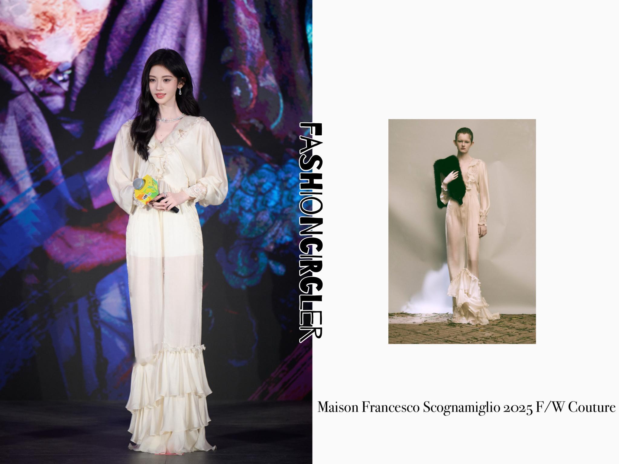 鞠婧祎今日出席腾讯视频活动造型图集,身着MAISON FRANCESCO SCOGNAMIGLIO 2025秋冬定制系列蕾丝荷叶边连衣裙,佩戴Fred斐登高级珠宝,贵气美丽,期待鞠姐的《来战》~