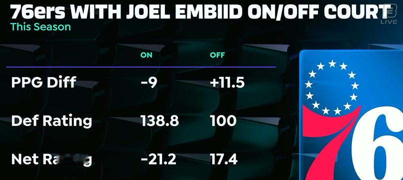 ☞符合观感,恩比德这几场在场大幅度拉低本队防守