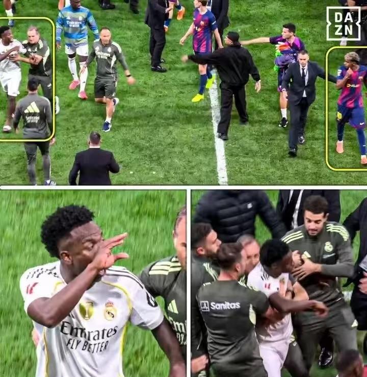 西班牙国家德比后续:巴萨处处给皇马挖坑,但是皇马和裁判就是不上当! 场景1: 佩德里:裁判,应该给贝林厄姆红牌!贝林:内格雷拉来了也不会出红牌! 实际情况:佩德里因对抗倒地,贝林上前摸了佩德里的额头,佩德里马上再次埋头倒地! 场景2: 费兰:维尼休斯,你怎么不罚点球了! 小熊笑着说:我不在乎,现在是姆巴佩罚! 实际情况:姆巴佩罚丢点球,费兰故意刺激维尼休斯,但好像没效果! 场景3: 亚马尔对着维尼休斯:要动手吗? 维尼修斯回应:来啊! 实际情况:亚马尔在赛后挑衅维尼休斯,双方都被拉住! 可以看出,国家德比真火爆,场内、场外和嘴上都是战场,各方面都在斗智斗勇,巴萨知道皇马球员的弱点,估计处处挖坑,多次找裁判投诉和抗议,但好像没啥效果,皇马球员一直保持冷静,裁判也不为所动! 个人感觉,但凡皇马球员中一次招,比赛结果就可能改变,大家怎么看?#西班牙国家德比#