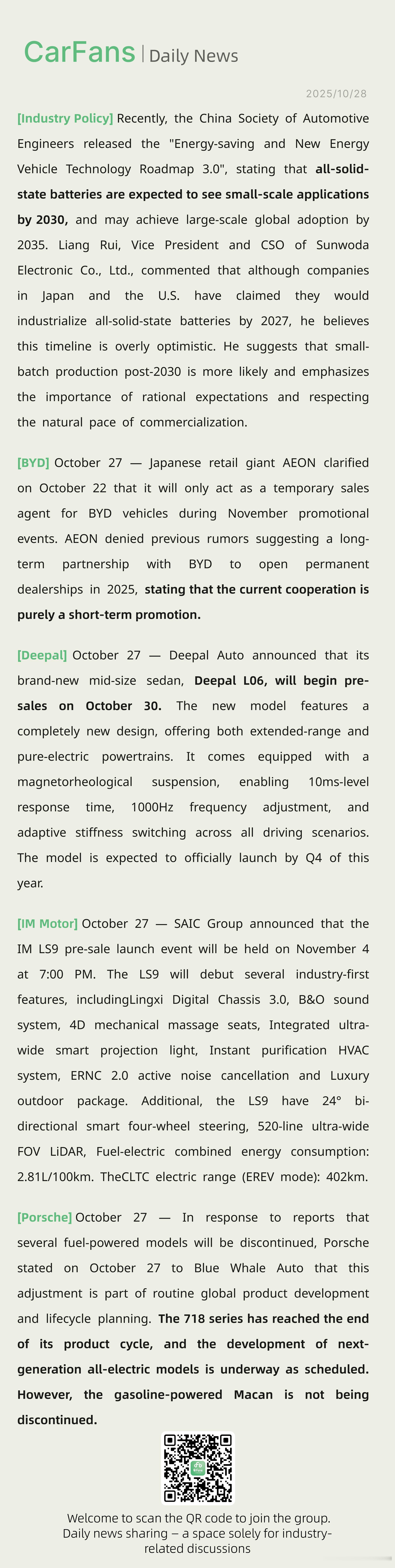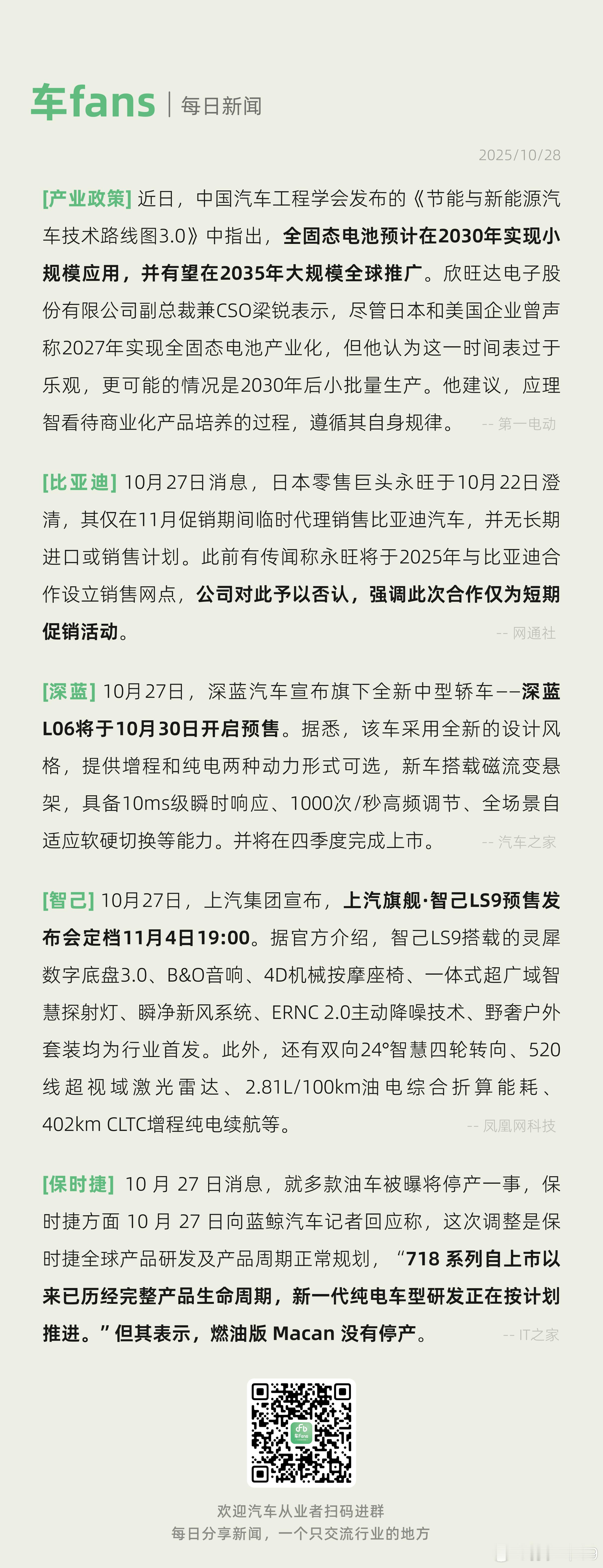 全固态电池预计在2030年实现小规模应用、深蓝L06将于10月30日开启预售中国