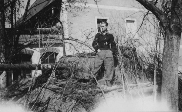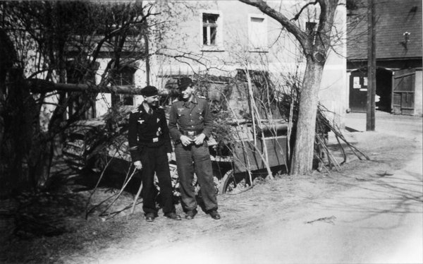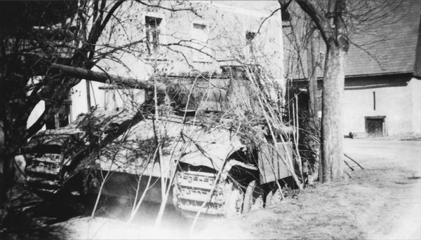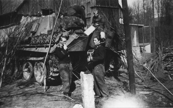 德国元首护卫师装甲团第二连的车长奥伯芬里希·迪特马尔在他的豹式G型坦克上合影留念,摄于东普鲁士的兰格诺尔斯村(今波兰奥尔希纳,位于劳班东南约16公里处)。1945年3月10日至20日,该师在此处休整并等待补充。 元首护卫师是德国国防军为希特勒提供的护卫部队,最初是从柏林护卫团(大德意志师的前身)的两个连中抽调的摩托化步兵排组成,称为Führer Reise。后来逐步膨胀并生成两个营级单位元首护卫营和元首掷弹兵营。当元首护卫营于1944年11月底升格为旅时,大德意志师装甲团第二营成为其装甲团第一营,照片中的坦克手右臂上的袖标就是大德意志师的袖标。