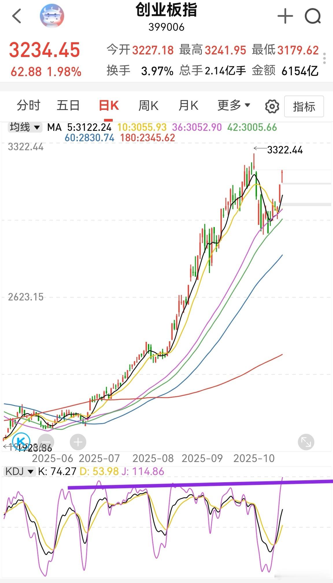 再看A股。创业板日线kdj走向相对高位,这里需要修复指标,今天预计小阳。