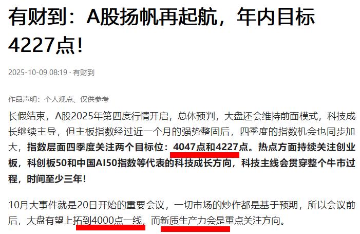 4000一跃而过,4047候场! 昨天大盘最高3999点,盘后东方财富有个调查说“4000点能否过?” 我想说的是格局太小了,4000点拿不下,何谈大牛市; 4000点是大牛市起点(林园说的是4300点); 所以4000点不是什么压力位! 那么为什么昨天最高3999点,用意是什么? 其实就是造成无法突破假象。 但科技大叙事浩浩荡荡,不是任何人可以改变的; 今天科技股会助力A股开盘价直接过4000点。 4000点不是压力位,后面的4047才是压力位; 4047是在826的时候给出的年内第二目标; 预计今明两天就会拿下! 今天除了关注科技股外, 其他“垃圾股”方向可能也会大幅拉升,比如ST 低价格 微盘股等! 因为《若干意见》规定,引导存在重大违法强制退市风险的上市公司控股股东、实际控制人等主动采取先行赔付或者其他保护投资者合法权益的措施,弥补投资者因上市公司及相关主体违法行为遭受的损失。 总之,今天看普涨格局,预计最迟明天就会切入4027-4047区间!目前大盘正按826剧本演绎!继续满仓前行!