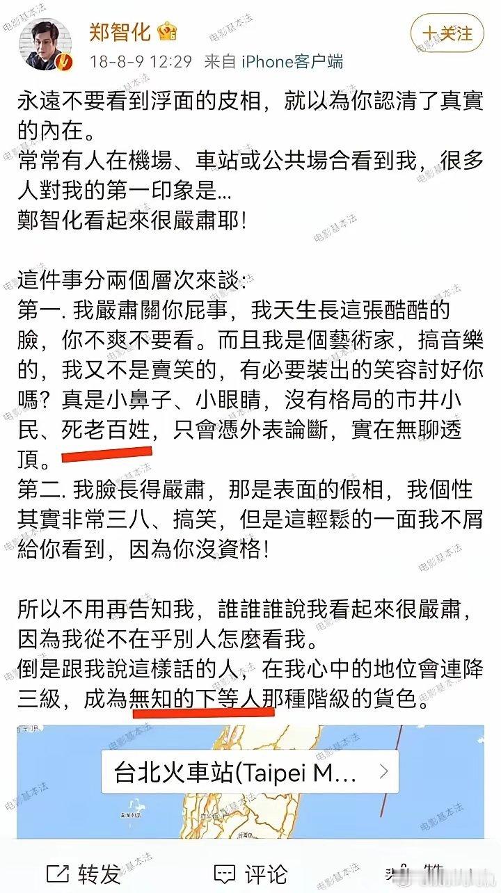 一直认为郑智化是一个非常高尚的智者,直到看到了他18年怒怼网友的言论,网友只是认为他严肃,他就暴跳如雷了,那种高高在上的态度让人非常意外,和他歌曲里表达出来的思想完全就是两回事,也就是说,他的歌只是他的人设,他唱的和做的根本不一样,他的真实为人根本不是那回事,所以,不要对任何明星有滤镜,他只是唱了你喜欢听的歌,根本不是你想象的那种人。