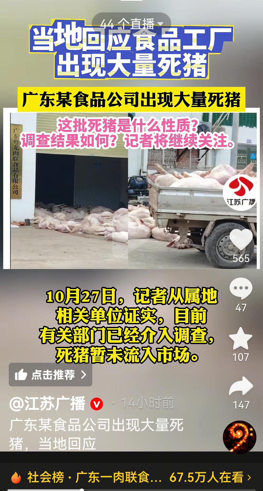 广东某食品公司出现大量死猪 根据记者报道,10月27日有关部门已经介入调查,死猪没有流入市场,案件在进一步调察中 幸亏发现了,要是没有发现怎么办 天天说消费,这咋敢消费啊,牛马当了,还得吃死的,这家肉联厂胆子太大了 必须严肃处理,该判就判吧养猪场死猪 病死猪乱埋 猪意外死亡 图片来自江苏广播视频