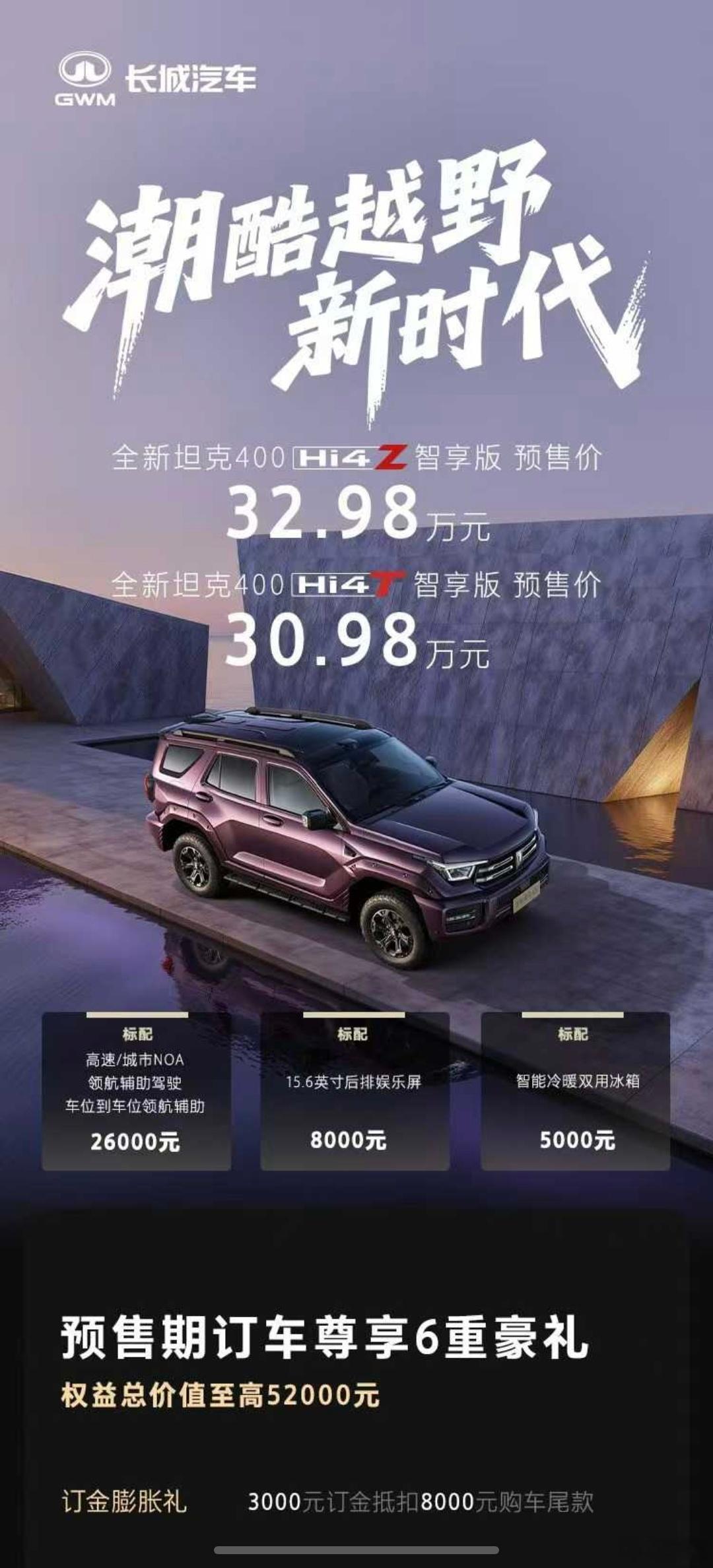 我看到坦克 400 预售价 30.98 万起,只有两个版本,价格紧凑,定位清楚。
