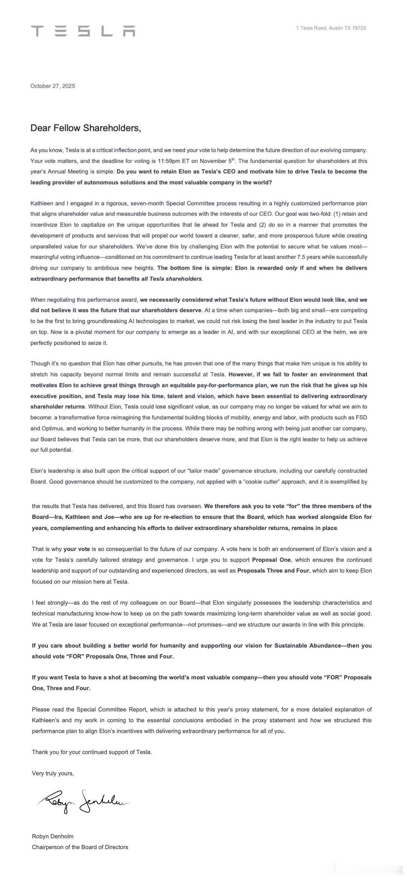 临近股东大会,特斯拉董事长「罗宾·丹霍姆」发布股东信,内容也很直接,