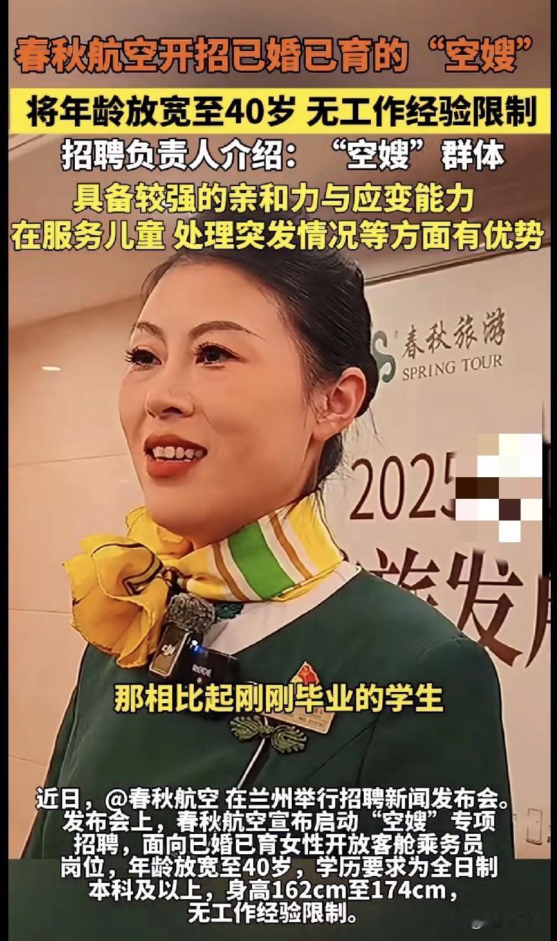 家人们快看!春秋航空这波操作太绝了!专门招已婚已育的“空嫂”,年龄放宽到40岁,还不用工作经验! 招聘的人说,“空嫂”们亲和力和应变能力都超强,照顾孩子、处理突发情况贼有优势。这对很多想重返职场的宝妈来说,简直是天大的好消息啊! 网友们都炸了:“终于有企业看到已婚已育女性的优势了”“这波操作太暖心,建议推广”。咱就说,这种尊重女性、看重实际能力的招聘,谁能不爱? 有没有符合条件的姐妹?冲就完了!也希望更多企业能像春秋航空这样,给不同阶段的女性更多机会!