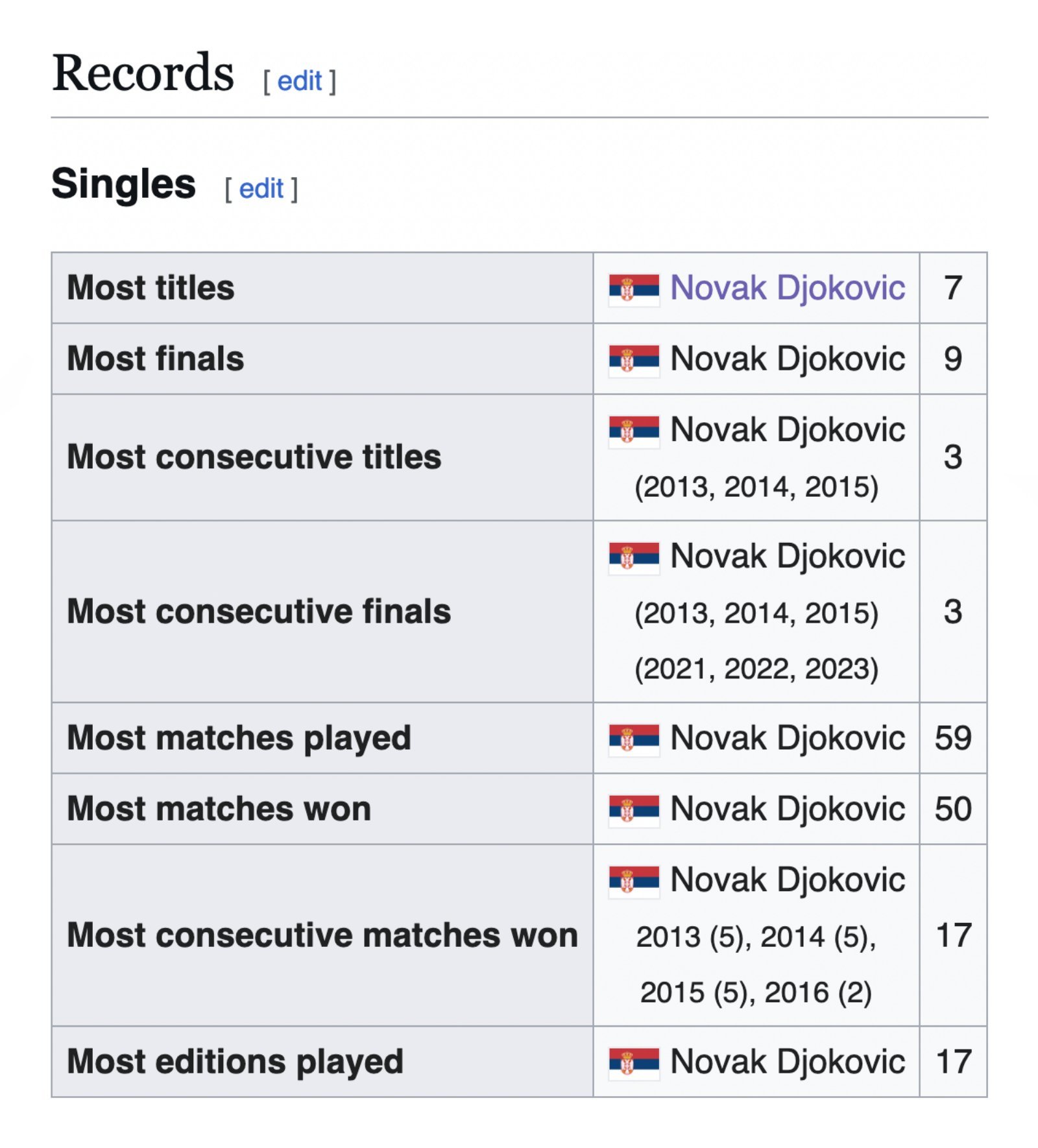 尽管德约科维奇连续两年缺席巴黎大师赛,但在维基百科里可以看到,这项赛事所有记录都已经在他名下!
