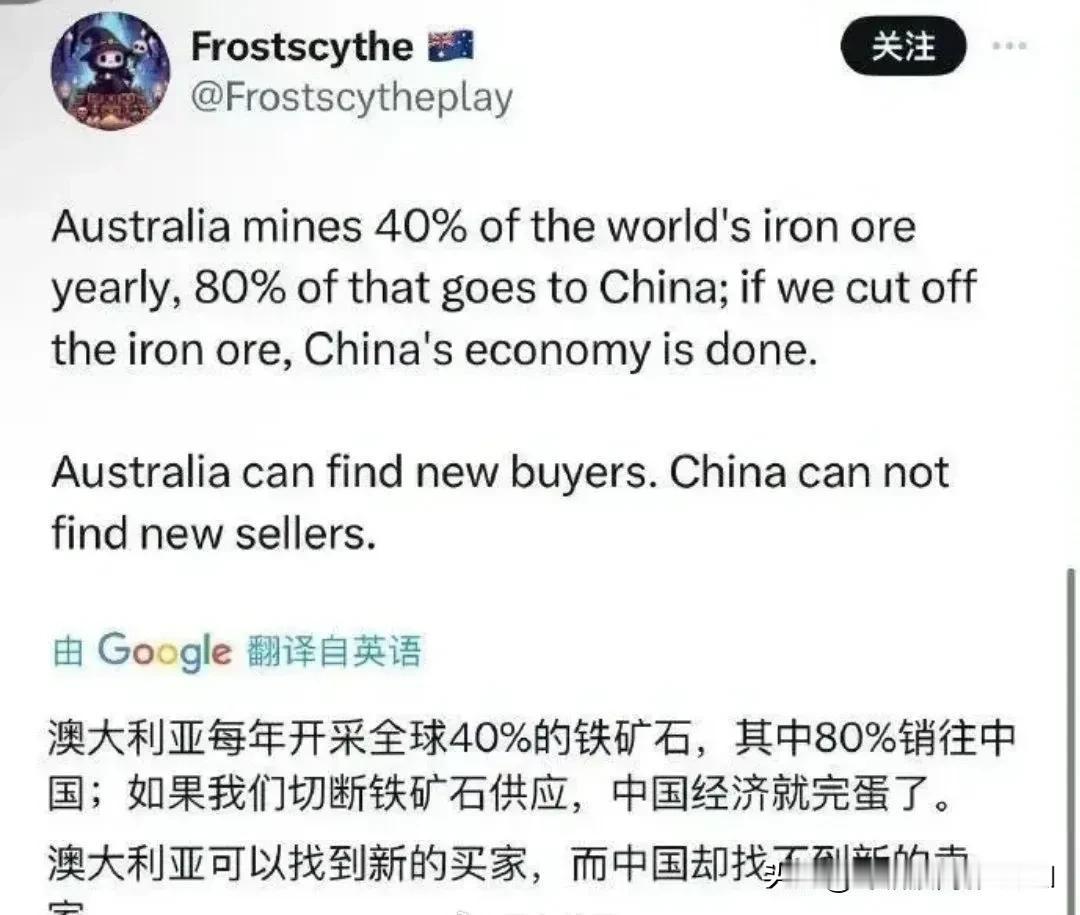 一名澳大利亚网友在互联网上说:澳大利亚每年开采全球40%的铁矿石,其中80%销往中国。如果我们切断铁矿石供应,中国经济就完蛋了。澳大利亚可以找到新的买家,中国却找不到新的卖家。 还没有等到中国人说话,一名美国网友在下面留言:如果真如你说的那样可以找到新的买家,你们连一丁点铁矿石也不会卖给中国。也不会屡次在铁矿石谈判中被中国拿捏了,刚刚谈成的用人民币结算铁矿石,是你们自愿的吗?