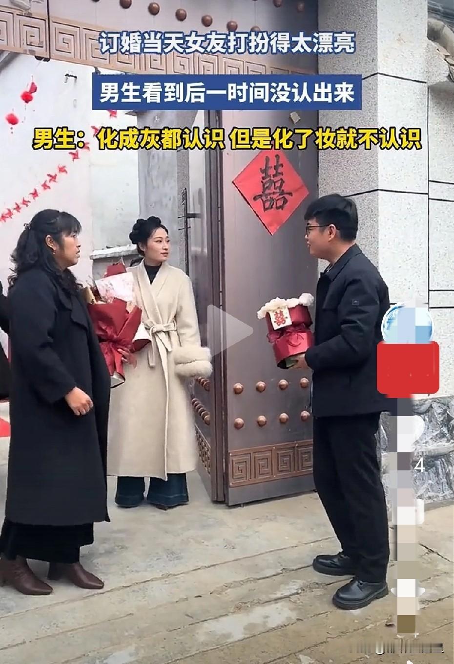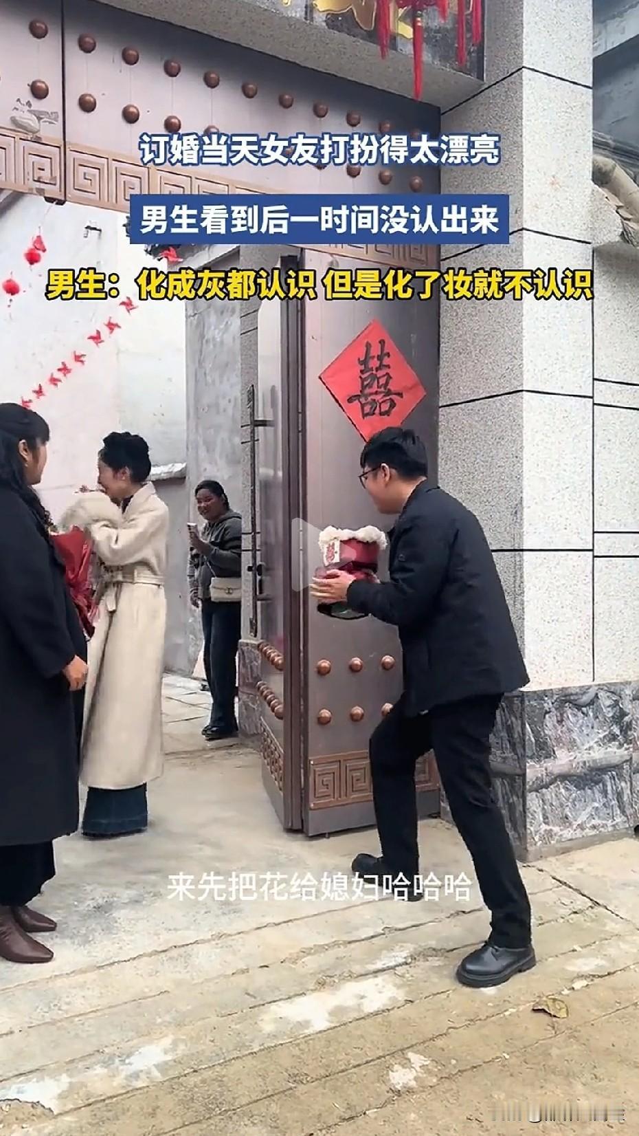 近日,一段“男生没认出订婚当天打扮漂亮的女友”的趣事引发了不少网友的共鸣。 事情是这样的:一位男子前往女友家正式订亲,见到站在门口的准岳母和一旁精心打扮的女友,他先是礼貌地将准备好的鲜花送给了准岳母,接着看向旁边的女孩——妆容精致、打扮亮眼,他竟然一下子没认出来那是自己的女友!只到有人喊先把花送给媳妇时,他才看清旁边化了女孩是自己女友,场面一度十分尴尬,女孩也不好意思地捂脸笑了。 这条视频一出,评论区瞬间涌来大量“同款经历”: 网友一:“和我一模一样!有次和女友约在常去的地方见面,我俩同乘一部电梯上六楼,我愣是没认出她……太尴尬了。” 网友二:“确实,拍结婚照那天我老婆化了妆,我第一眼都没敢认,和平常素颜差别太大了!” 还有网友调侃:“我冲着20万彩礼找的媳妇,这一化妆像是30万的,我一时没反应过来。” 更有网友金句频出:“化成灰我都认得,化了妆倒不认识了!这再次证明——化妆真是女人的‘易容术’!” 一场订婚的小插曲,意外掀起了关于“化妆改变颜值”的搞笑讨论。你有没有遇到过类似“熟人变陌生人”的场面?快来评论区分享你的故事吧!
