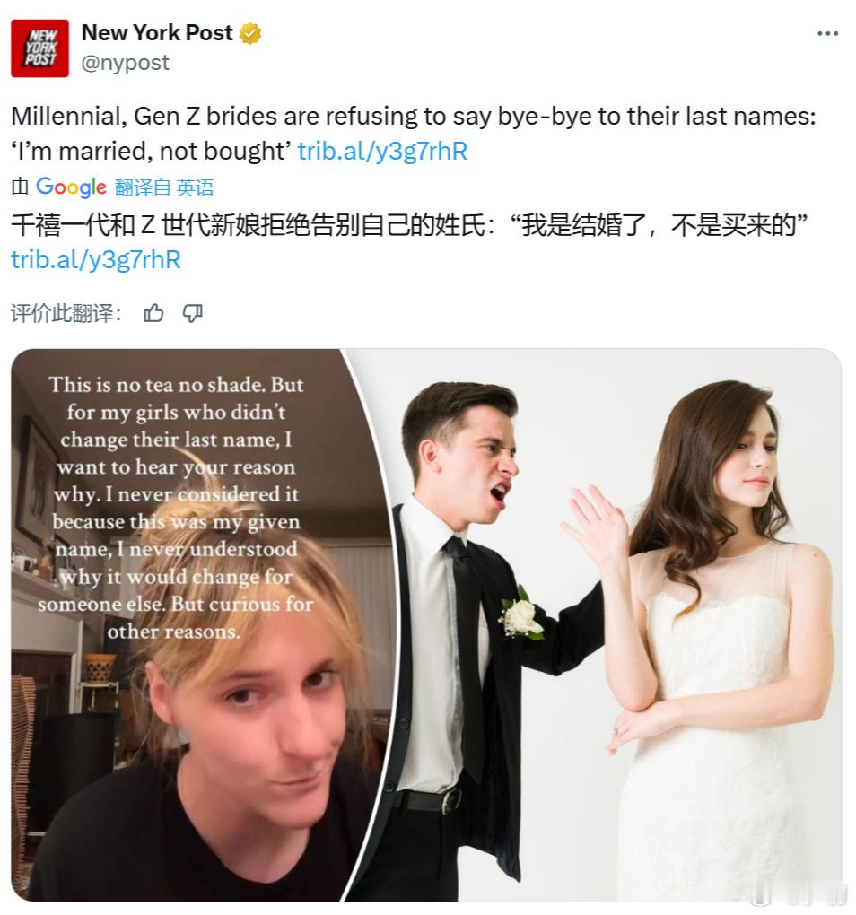 纽约邮报::“我是结婚了,不是买来的”!美国新世代的新娘拒绝告别自己的姓氏。在极度现代的千禧一代和Z世代女性中,大胆放弃使用新婚丈夫的姓氏正成为一种日益流行的趋势。她们宁愿保留出生证明上的名字,也不愿为了迎合大众而牺牲自我。