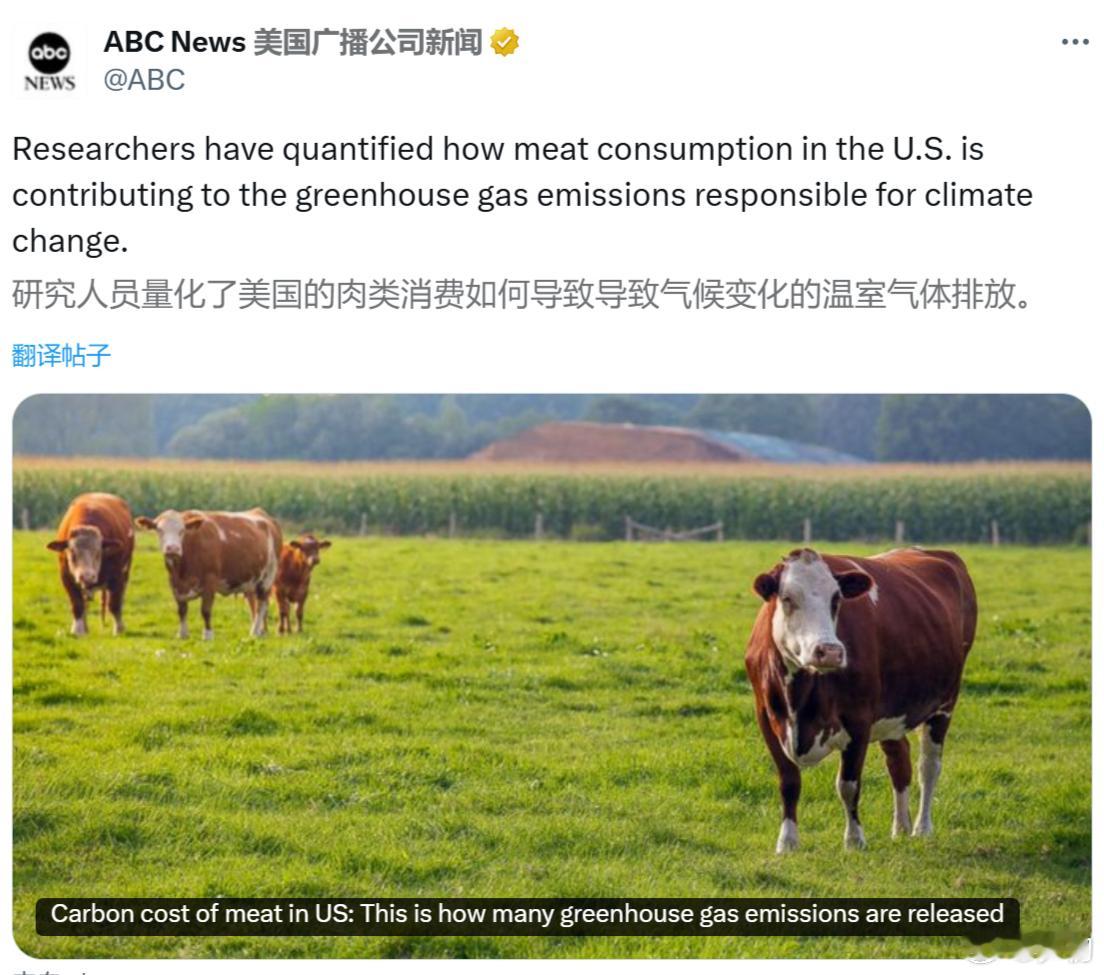 美国广播公司新闻(ABC):研究人员已经量化了美国肉类消费对导致气候变化的温室气体排放的影响。一项研究表明,美国消费产生的排放量与化石燃料使用量相当。