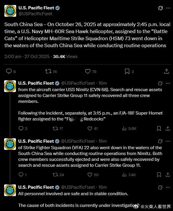 两架美国海军飞机在南海坠毁-美国太平洋舰队