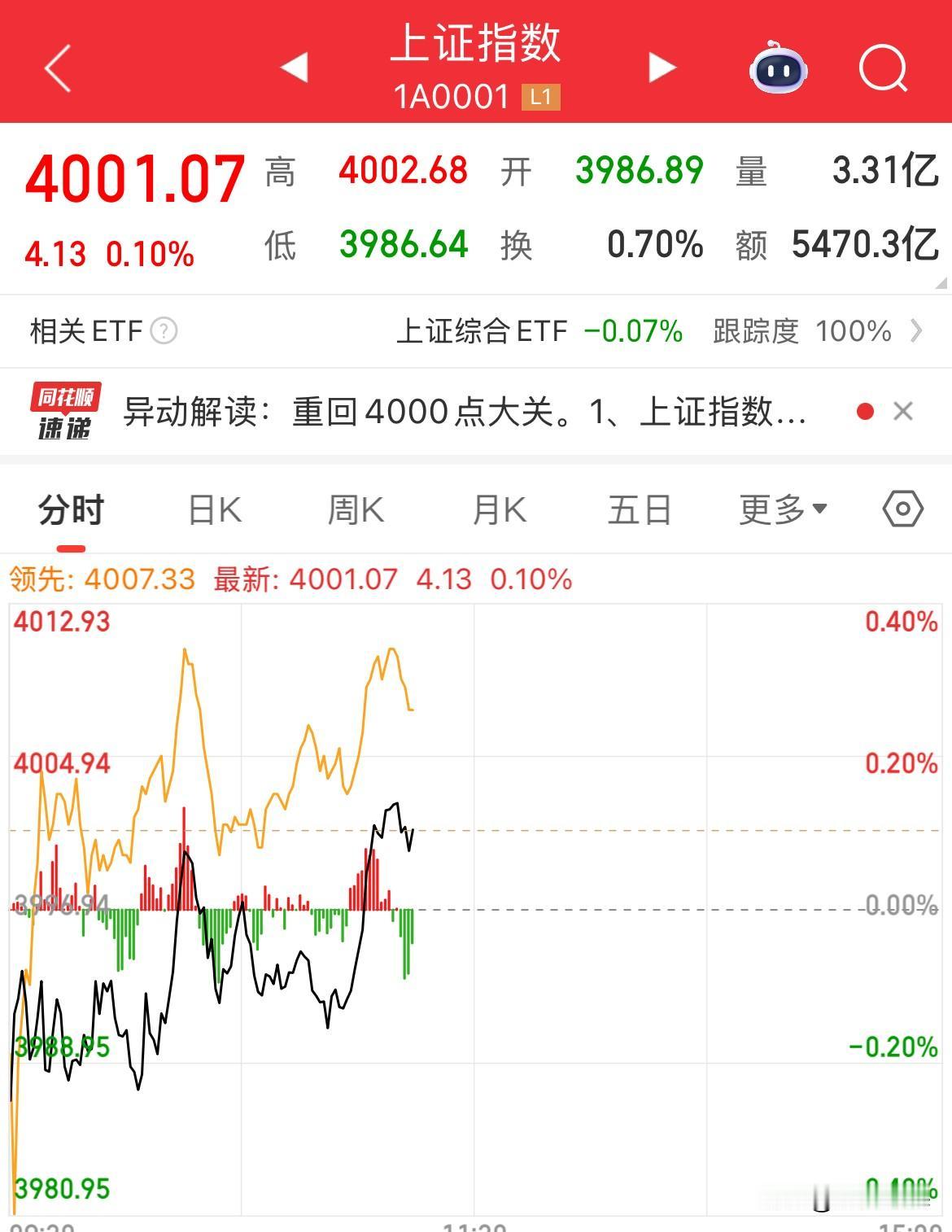 4000点已到了,接下来是多少4500,还是5000点,指数多少没有意义,得账户的收益跟上才行 指数全线探底回升,创业板大涨1%,上证也是不负众望的突破4000点了,指数已经到4000点了,你账户跟上了没, 成交额缩量2300亿,内资疯狂流出300多亿,到了这个位置,风险还是机会,是一路狂奔,还是要摩擦摩擦, 只能说做好自己的节奏和趋势,不管多少点,呵护好自身的钱最重要。