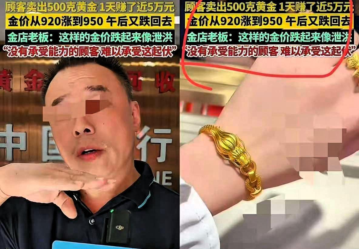 浙江杭州,顾客为了赚快钱,直接买了500克黄金,第二天就卖了,仅仅1天时间,就赚了近5万元 刷到这消息谁不眼红?但先别着急跟风,这事儿背后的风险比你想的大10倍! 谁能想到金价能疯狂成这样?上午还920一克,中午飙到950,结果下午直接跌回原点。大哥这波操作纯属踩中了运气,可别把偶然当必然! 最惨的是跟风的普通人,有个老顾客看着别人赚钱眼热,立马入手200克,结果刚付完钱金价就跌。天天往金店跑追问“涨了没”,等了三天没动静,急用钱只能割肉亏2000多卖掉,临走撂下一句“再也不碰了”,想想都心疼。还有人更贪心,想着再涨点多赚点,结果金价转头就跌,黄金直接砸手里,卖吧亏太多,留着又怕继续跌,急得整夜睡不着觉。 其实短期炒金根本不是投资,就是纯赌运气!金价受国际形势、美元走势这些复杂因素影响,咱普通人哪儿能预判?那些看似赚快钱的,赚的都是“认知外的运气钱”,这次赚了下次大概率得亏回去。 黄金的正经用法,从来都是长期资产配置。比如每年固定买100克存着,既能抗通胀,又能当个应急保障,稳稳当当才靠谱