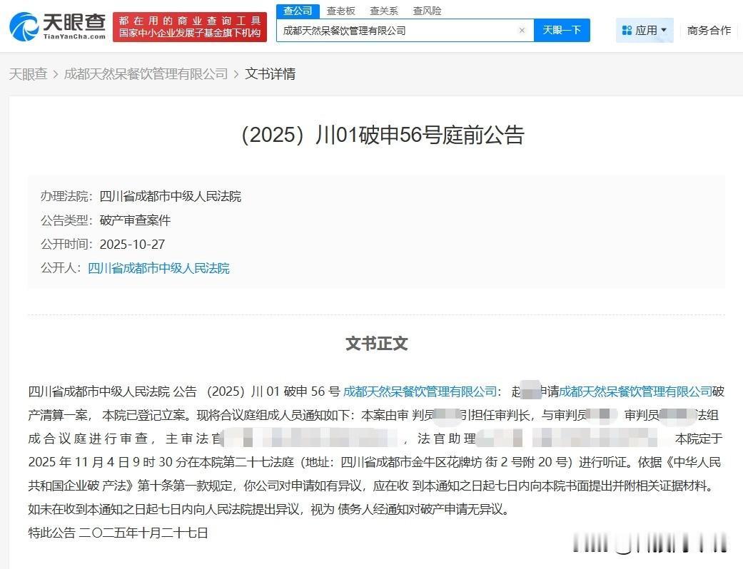 【关晓彤曾代言的天然呆再被申请破产 天然呆再被申请破产】 天眼查天眼风险信息显示,近日,成都天然呆餐饮管理有限公司新增一则破产审查案件,申请人为赵某,经办法院为四川省成都市中级人民法院。相关文书显示,该案件将于11月4日进行听证。 成都天然呆餐饮管理有限公司成立于2020年8月,注册资本500万人民币。股权全景穿透图显示,关晓彤父亲关少曾通过彤梦心缘(成都)文化传媒有限公司间接持有天然呆公司35%的股份。值得注意的是,该公司曾在2024年9月被申请破产审查,但该案件经审查后未获法院受理。 天眼查信息: