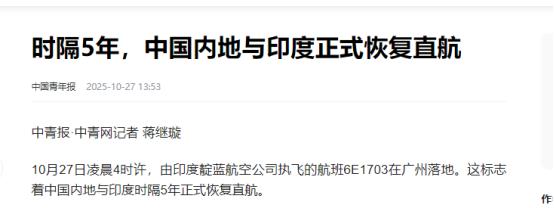 中方和印度同时宣布! 2025年10月27日,印度和中国正式恢复了中断五年的直航航班,首架飞机从加尔各答飞往广州。这次直航重启是由印度最大航空公司靛蓝航空完成的,接下来十一月还会开通新德里到上海和广州的航线。 首航实际在26日晚起飞,靛蓝航空A320neo客机载176名乘客出发,机场办了点油灯的庆祝仪式。这班飞机落地广州时,标志着两国五年直航空白的终结。 落地时间是27日凌晨3点49分,整架客机的上座率达到了100%,可见大家对这条航线有多期待。 加尔各答机场的庆祝仪式办得挺用心,工作人员组织乘客亲手点亮油灯,中国驻加尔各答代总领事秦勇也到了现场。他直言这一天对双方都很重要,是双边关系正常化的关键一步。靛蓝航空CEO彼得·埃尔贝斯更直接,说这条航线能让人员、货物和想法顺畅流动起来。 之前这条航线一停就是五年,背后的原因挺复杂。2020年3月,印度先因疫情停了所有国际航班。当年6月加勒万冲突爆发后,直航就彻底没了重启的可能。这五年里,两国旅客往来得绕远路,中转香港、新加坡或迪拜是常事,光路上就得多花四五个小时。 直航能重启,不是突然的决定。今年8月,两国外长在新德里会谈时,就把恢复直航写进了10项成果里。之后几个月,双方航空官员一直在谈技术细节,终于敲定了方案。印度政府也松了口,说这能促进人员往来,帮双边交流慢慢回到正轨。 后续的航线安排已经排上了日程,11月9日起,中国东航会恢复上海往返新德里的航线,每周三、六、日各飞一班,现在机票已经开卖了。靛蓝航空更勤快,11月10日就要开新德里到广州的每日航班,看来是想抢着占市场。 加尔各答当地商界对这事特别欢迎,加尔各答商会主席拉吉夫·辛格算过账,直航能减少物流和中转时间,企业进货出货都更方便。要知道,加尔各答和中国有几百年渊源,当地的中印融合菜肴现在还是特色,直航恢复后,旅游业估计也能跟着回暖。 其实货运航线早就悄悄恢复了。靛蓝航空在鄂州花湖机场都开了5条去印度的货运线,拉的全是笔记本电脑、医疗设备这些货。过去一年,这家航司光在花湖机场就飞了近400架次货运航班,运了6000多吨货。现在客运跟上,两国的联系就更紧密了。 国际航协理事长威利·沃尔什也看好这事。他说中印这两个大市场复航,不光航空公司能受益,整个航空市场的增长潜力都能被带动起来。毕竟疫情前,两国每月有超过500个直飞航班,现在慢慢恢复,肯定能回到当年的热闹劲儿。 不过也得说,两国关系还有没解决的问题。比如中国企业去印度投资的限制、跨境河流的数据分享这些事,还得慢慢谈。但不管怎么说,直航先通了,这总是个好开头,至少28亿人的往来能先方便起来。 来源:中国青年报 【时隔5年,中国内地与印度正式恢复直航】