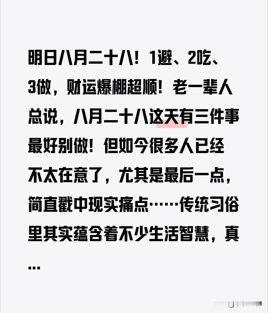 星期日八月二十八!1避、2吃、3做,财运爆棚超顺! 老一辈人总说,八月二十八这天有三件事最好别做!但如今很多人已经不太在意了,尤其是最后一点,简直戳中现实痛点……传统习俗里其实蕴含着不少生活智慧,真的值得我们好好传承。民俗文化 生活智慧 八月二十八真的有这么多讲究吗?了解完古人的提醒才发觉,我们现在忽略的太多了!先别觉得这是迷信,这些老规矩背后藏着的,可都是实实在在的生活道理。 不让爬山真的是因为危险吗?其实是在提醒大家安全最重要!现在不少人喜欢挑战野山探险,结果迷路遇险的新闻时常能看到。不如叫上几个朋友,一起去公园走走,既安全又能聊天散心,还能拉近彼此的关系。 说到吃鱼,邻居老王前天刚做了一道八爪鱼炖偏口鱼,一家人吃得特别满足。其实不用搞得太复杂,简单的清蒸鲈鱼照样寓意“年年有余”!萝卜牛腩煲也是一道省时好菜,下班回家半小时就能上桌,暖身又象征好兆头。 最让人有感触的是第三点:记得回家看看爸妈!同事李姐特地请了一天假,帮父母换上了厚被子,还囤好了过冬的蔬菜。老人家高兴得不得了,直说:“孩子能回来,比什么礼物都强!”现在大家总说忙,但尽孝这件事,真的不能一等再等。 这些传统习俗并不是要限制我们,而是用特别的方式提醒我们:生活需要一些仪式感,家人更需要我们的陪伴。你们家里还保留着哪些有趣的习俗?快来评论区里聊一聊吧!民俗文化 生活智慧九月的吉日 九月的财运 初五蹬山迎财神 八月底财运 初六关帝公出巡 脂月二十八习俗