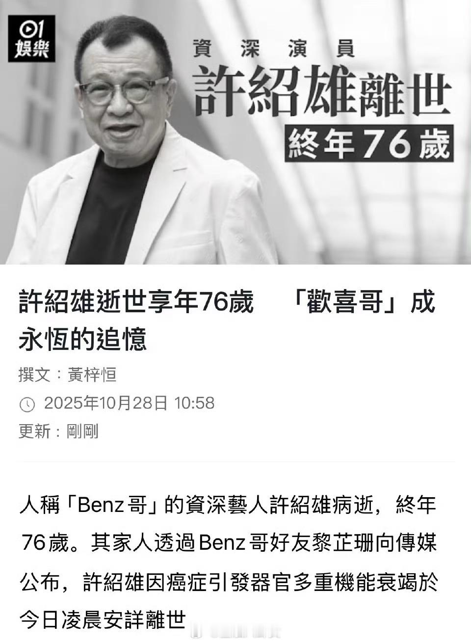 欢喜哥许绍雄逝世许绍雄离世,享年76岁。