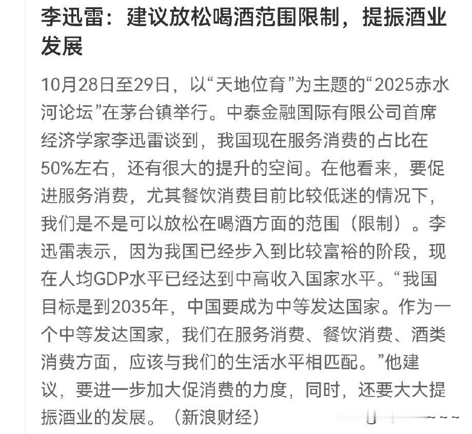 注意!🔥🔥 卖酒的,开饭店的福音来了? 李迅雷建议:放松喝酒范围限制,提振就业发展。 第一感觉这个建议还是很灵的。因为人的酒量肯定是越喝越大[捂脸]。3—5好友在不影响工作的前提下,经常去聚餐,那得提高多少消费啊? 听同事说,她老公是在编的,本来以前还经常下下馆子,现在几乎就是家里吃了,因为喝酒要报备,还有时间规定! 还有一些单位,像“帽子”叔叔,禁酒令也管的挺严的。 如果把喝酒这件事给盘活了,我感觉消费,特别是对酒企肯定是大利好,现在年轻人都不怎么喝酒了,如果还管得这么严,那以后就更不想喝了。 你们说,李迅雷这个建议怎么样? 李迅雷,出生于1963年9月,浙江宁波人,上海财经大学世界经济系国际贸易专业研究生毕业,中泰证券首席经济学家。之前他曾经说过两句话记忆犹新,通过刺激消费拉动经济,刺激富人消费扩大就业。