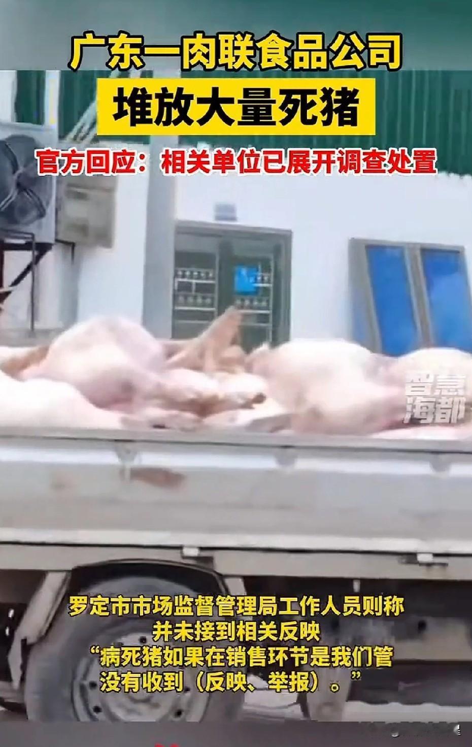 胆子太大了! 近日,有网友发视频显示,在广东某肉联公司门口,惊现大量死猪露天存放。此前就有网友爆料,该企业疑似从外部收购死猪用以加工,威胁食品安全。 触目惊心!食品安全关系到千家万户的身体健康,而这些企业却胆子这么大,竟然为了一已私利丝毫不顾百姓身体健康。 我敢肯定,这起事件,不仅仅只是个例,该企业也不会仅仅是这一次。 这起事件不仅暴露了企业管理上的漏洞,也折射出整个行业在监管和管控方面的深层次问题,必须引起重视。肉联公司门口堆满死猪 7人被控制