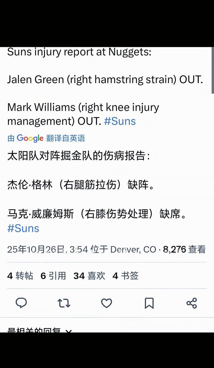 杰伦·格林腿筋拉了,马克·威廉姆斯膝盖歇了,太阳队这仗还没打,先缺了两根顶梁柱。 掘金那边穆雷脚踝还肿着,但人铁定上场——人家是丹佛的定海神针,伤也得咬牙打。 布克和比尔今晚得扛起全队,一个人防两人,一个人打三个人,这不是打球,这是开盲盒。 太阳没内线,掘金就敢往里硬凿;太阳没后场轮转,穆雷就能把节奏捏成麻花。 这哪是常规赛? 这分明是季后赛提前预演,拼的不是天赋,是命硬。 没人喊苦,没人喊累,伤病名单写得清清楚楚,可球场上,谁不是带伤上阵的狠人? 你缺人,我带伤,看谁先撑不住。