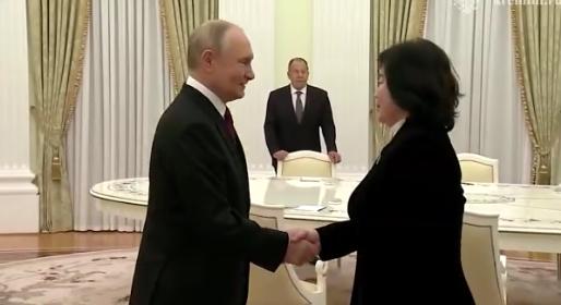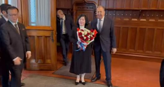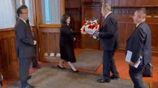 朝鲜外长在克里姆林宫与俄罗斯领导人普京会面,俄外长拉夫罗夫在侧。有意思的是,两国高层举行会晤之际,美国总统特朗普正在亚洲展开全球瞩目的访问。 有个细节,俄罗斯外交部长谢尔盖·拉夫罗夫在双方举行会谈前,手捧鲜花迎接朝鲜民主主义人民共和国外交部长崔善姬,以表致意。 会上,俄方声明,俄罗斯永远不会忘记朝鲜在解放库尔斯克地区期间的军事功绩。