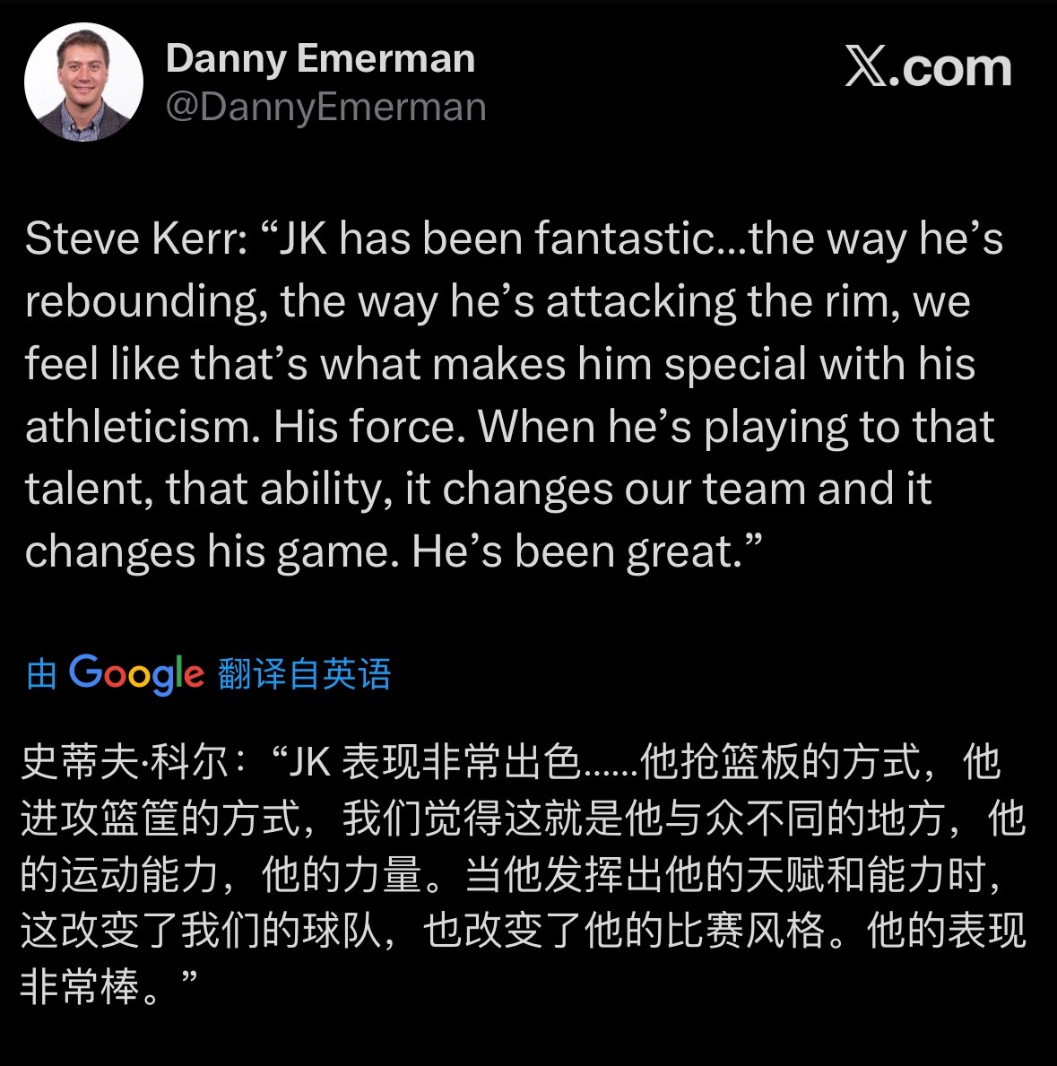 “JK 表现非常出色……他抢篮板的方式,他进攻篮筐的方式,我们觉得这就是他与众不同的地方,他的运动能力,他的力量。当他发挥出他的天赋和能力时,这改变了我们的球队,也改变了他的比赛风格。他的表现非常棒。”