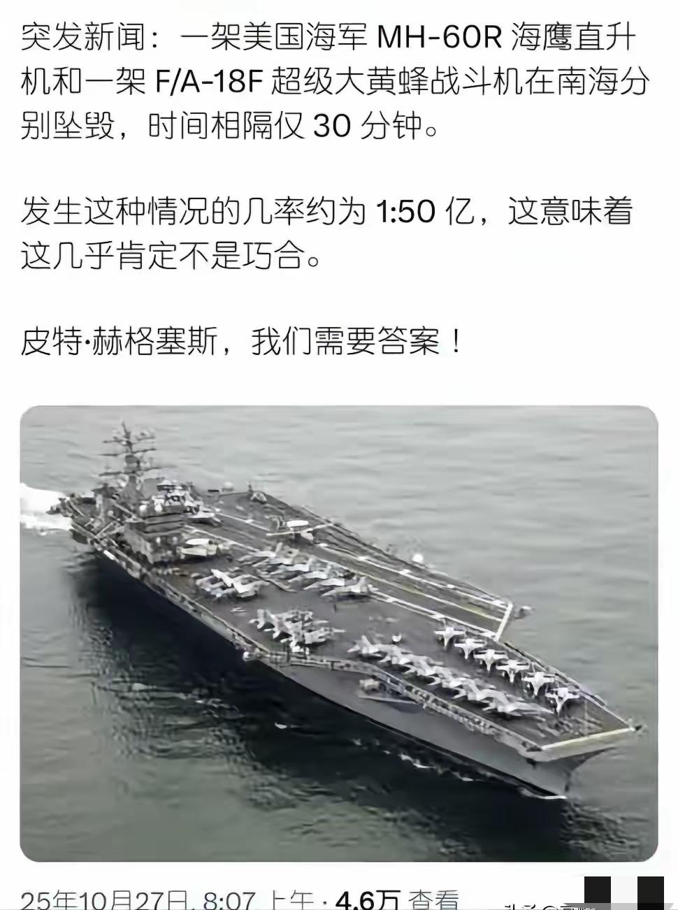 藏不住了!美军两架飞机坠机,美国开始媒体慌了,直接把矛头指向中国!两架飞机同时坠毁概率低于1:50亿,一定有是龙哥神秘武器! 南海这片浩瀚海域,从来就不平静。一架MH-60R“海鹰”直升机刚在下午2点45分坠海,仅仅30分钟后,一架F/A-18F“超级大黄蜂”战斗机也跟着栽进波涛之中。两架飞机都来自美国“尼米兹”号航空母舰,像约好了似的接连坠毁,这出戏码恐怕连好莱坞编剧都不敢这么写。 50亿分之一的概率究竟意味着什么? 美国网友自己算了一笔账,这种事情发生的可能性微乎其微,简直比连续中十次彩票头奖还难。难怪美国媒体坐不住了,急着寻找替罪羊,恨不得马上把矛头转向中国。 “尼米兹”号航母大老远跑来南海,可不是来观光的。它10月21日刚刚抵达马来西亚大纳土纳岛东北部的南海水域,美国海军新闻频道直言不讳地宣称,这次部署“向某国的海上野心发出了强烈信号”。结果信号没发成,自己先折了两架飞机,尴尬不尴尬? 美军舰机常年在中国周边打转,嘴上喊着“航行自由”,脚却踩进了别人家后院。一位外国网友说得一针见血:“太平洋没在沉默,而是咆哮”!南海沿岸国人民共同守护这片祖祖辈辈赖以为生的蓝色家园,容不得外人撒野。 看看“尼米兹”号的历史吧,这艘航母已经服役50多年,老态龙钟。美军装备老化、维修拖延、技艺不精、违规操作的问题早已不是秘密。说不定正是这些内部因素,导致了这场匪夷所思的事故。 两架飞机上的五名机组人员总算全被救起,算是不幸中的万幸。但美军对坠机具体地点讳莫如深,这里面难道有什么不可告人的秘密? 美国一些人的思维定式从未改变——出事就先怪别人。自家后院起火,第一反应不是查找火源,而是指责邻居。这种荒谬的叙事我们见得太多,南海局势紧张时他们如此,台海风起云涌时他们也如此。 全球网友的眼睛雪亮。“美国战机和直升机怎么会如此接近一个国家?想干什么!那不是他们的领土”!这句话问得痛快,道破了问题的实质。别人家的安全线,被当作了展示武力的舞台。 美军宣称事故原因仍在调查,那就请他们拿出诚意,给国际社会一个透明、公正的交代。别再用那些“可能”、“或许”的模糊辞令搪塞世界,更别再上演“甩锅”中国的老套戏码。 南海风急浪高,绝不是炫耀武力的地方。这两起离奇坠机事件,或许正是南海对和平的呼唤。那些执意要来搅浑水的域外国家,该听听这海浪的声音了。 各位读者你们怎么看?欢迎在评论区讨论。