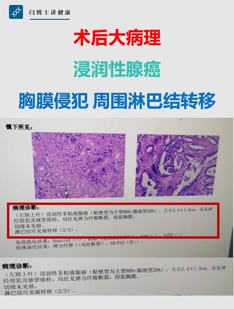 术后大病理提示:患者左上肺实性结节为浸润性腺癌,贴壁型占80%,腺疱型