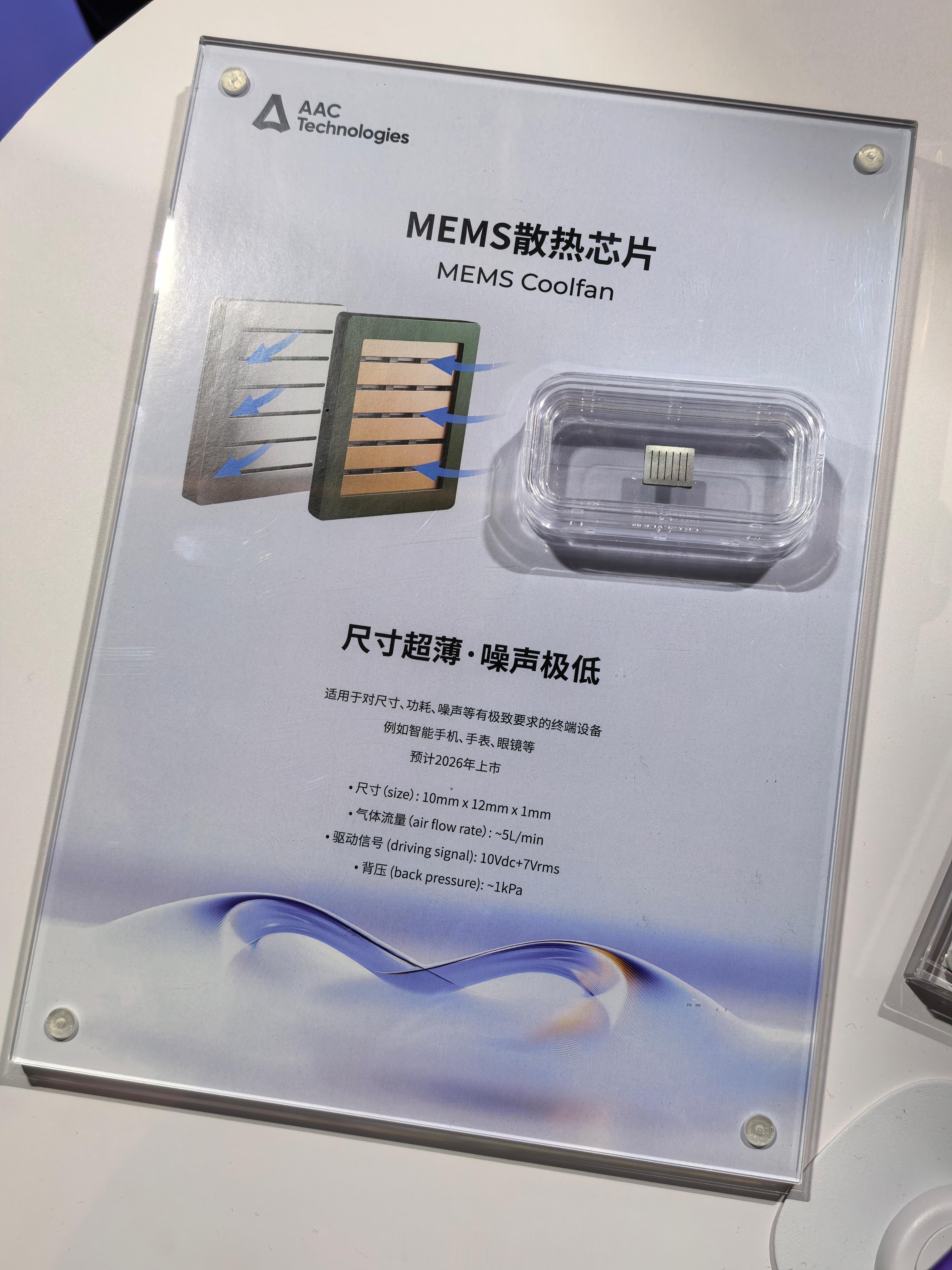 另一种路线的风扇 MEMS 散热风扇(也会有厂商营销成“芯片”),相较传统风扇,厚度超薄只有 1mm,预计 2026 年 Q3 实装,常规及超薄尺寸机型也能塞的下了,可以多留意明年下半年的新品;