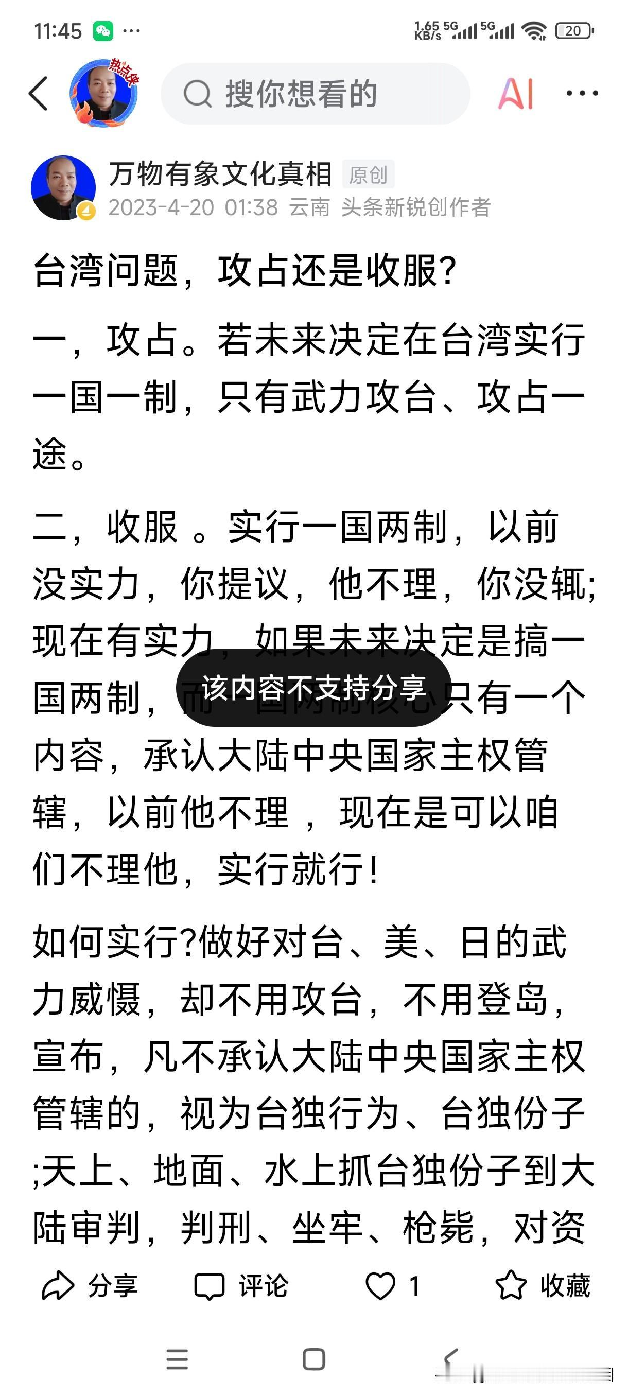 台湾问题,攻占还是收服?——下文是我2023年的建议(有人居然不允许分享,提高的水平吧),现在终于实行了!点赞国家的英明决策,国家统一,中华复兴在望。 ——“《台湾问题,攻占还是收服》 一,攻占。若未来决定在台湾实行一国一制,只有武力攻台、攻占一途。 二,收服 。实行一国两制,以前没实力,你提议,他不理,你没辄;现在有实力,如果未来决定是搞一国两制,而一国两制核心只有一个内容,承认大陆中央国家主权管辖,以前他不理 ,现在是可以咱们不理他,实行就行! 如何实行?做好对台、美、日的武力威慑,却不用攻台,不用登岛,宣布,凡不承认大陆中央国家主权管辖的,视为台独行为、台独份子 ;天上、地面、水上抓台独份子到大陆审判,判刑、坐牢、枪毙,对资助台独势力、台独份子的个人、组织、国家采取各种制裁措施,要抓人,查、扣、没收资产,大搞统一战线,打击面最少,团结面最大,造成岛内岛外对台独避之唯恐不及的状态。一国两制,终究是台人治台,所以完全不用搞什么武力攻台、攻占,不管谁上台,承认大陆中央国家主权管辖就行!此谓收服! 如此,让美国找不到干涉借口,能最大限度争取国际支持,不攻台,不登岛,却做好迎击台独、美、日先开枪、开炮的准备,如此台独、美、日全无胜算。”