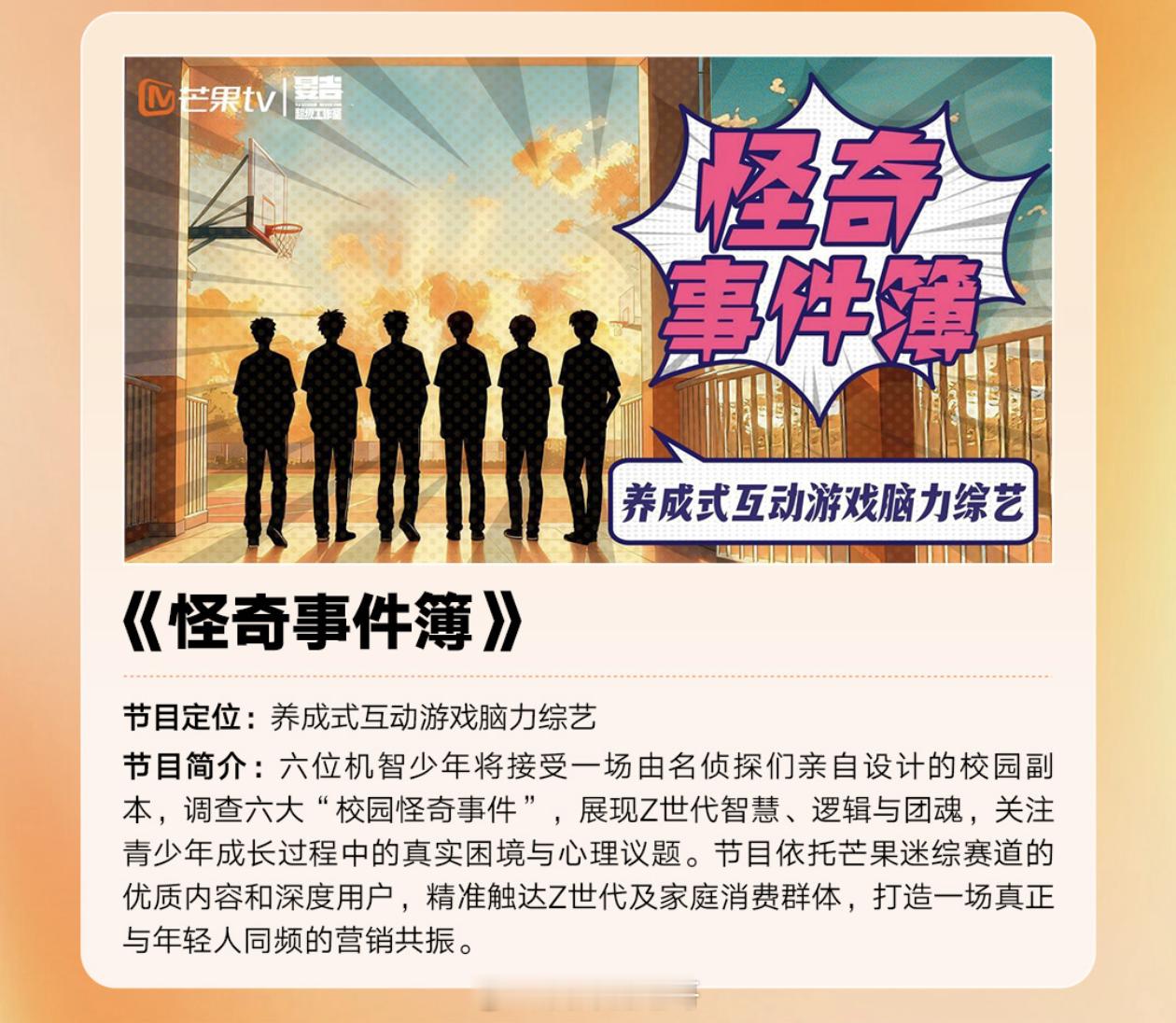 节目简介:六位机智少年将接受一场由名侦探们亲自设计的校园副本,调查六大“校园怪奇事件”,展现Z世代智慧、逻辑与团魂,关注青少年成长过程中的真实困境与心理议题。节目依托芒果迷综赛道的优质内容和深度用户,精准触达Z世代及家庭消费群体,打造一场真正与年轻人同频的营销共振。》